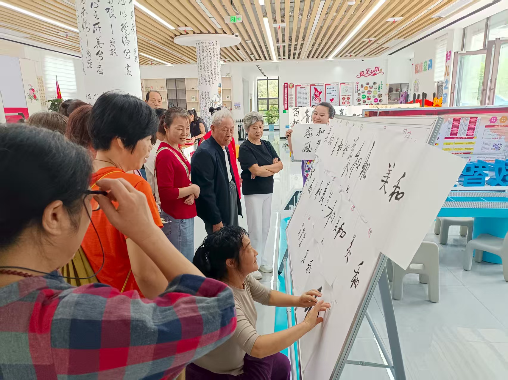 此次书法展突破了传统文化书法展“就字论字”的模式,引入“家风故事分享会”环节。群众既可分享好的家风故事,也可聆听老师讲述家训故事,实现“读字、听故事、悟家风”的沉浸式体验。“手腕要稳,下笔要轻”,书法老师在宣纸上写下“和美”两个字,并讲解了这个词的含义。老师不仅传授了基本笔画技巧,更通过字形结构分析,让参与者理解汉字背后的家风文化。
