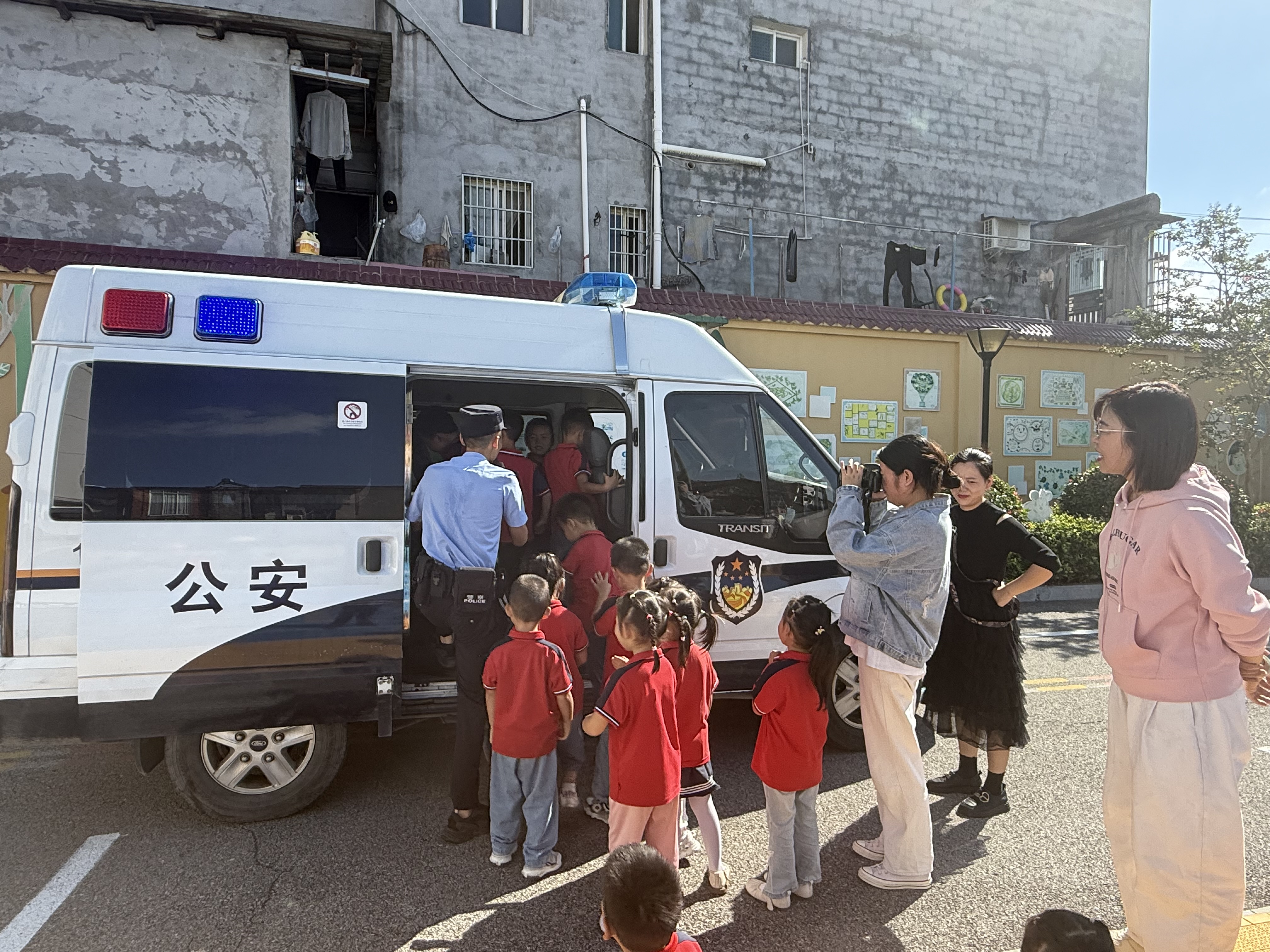 警用装备亮相,萌娃惊叹连连。活动中,民警向孩子们展示了手铐、警棍、防暴盾牌、急救包等日常执勤装备,并逐一讲解其用途。“这个像‘魔法盾牌’的东西,可以保护警察叔叔不被坏人伤害哦!”民警用童趣的语言配合实物演示,引得孩子们睁大眼睛连连惊呼。孩子们还通过触摸部分装备,体验当“小小警察”的成就感。幼儿园操场上的警车成为全场焦点。民警打开警灯,演示了警报器的不同鸣笛声,并邀请孩子们轮流坐上警车,近距离观察车载设备。