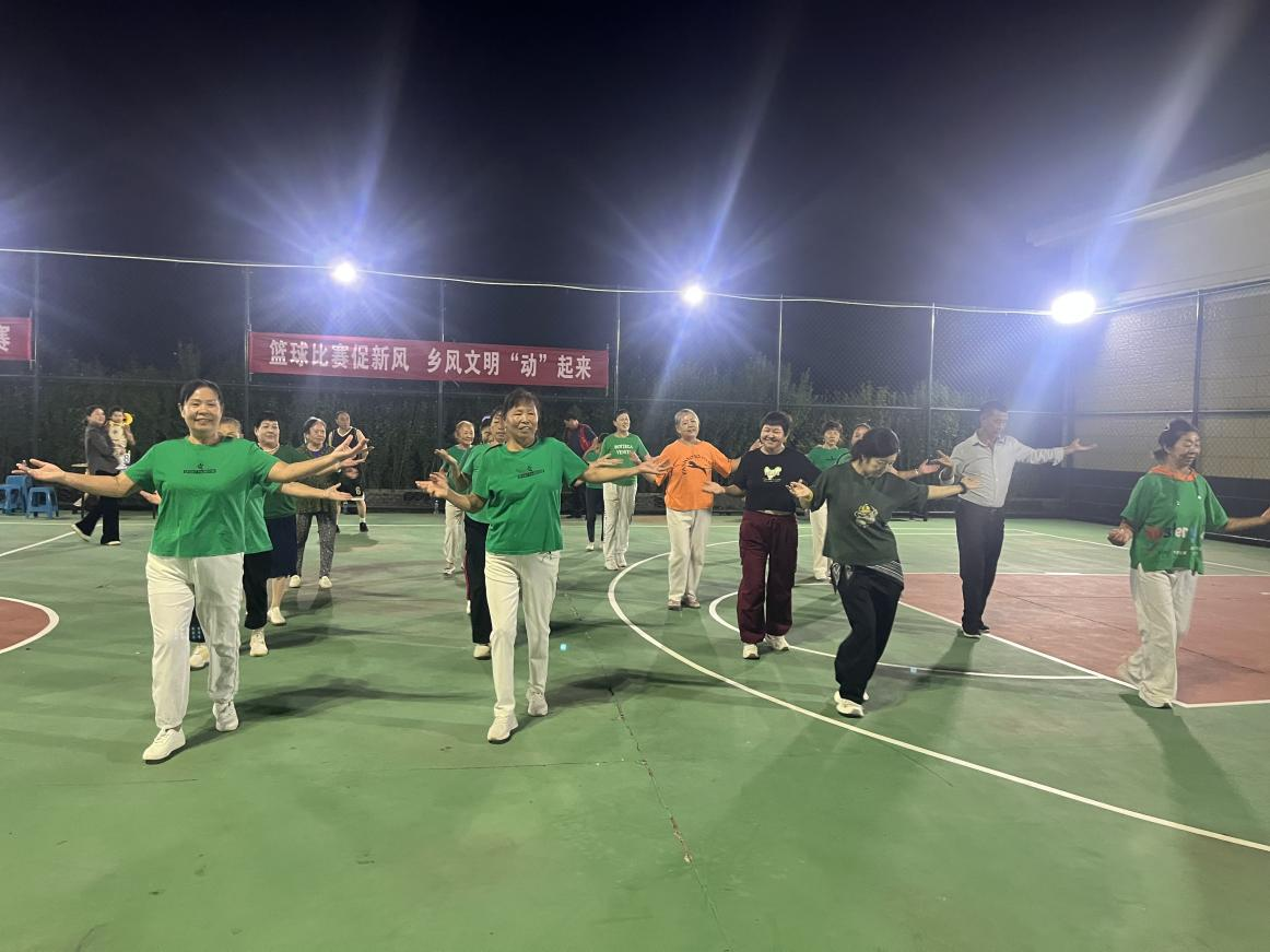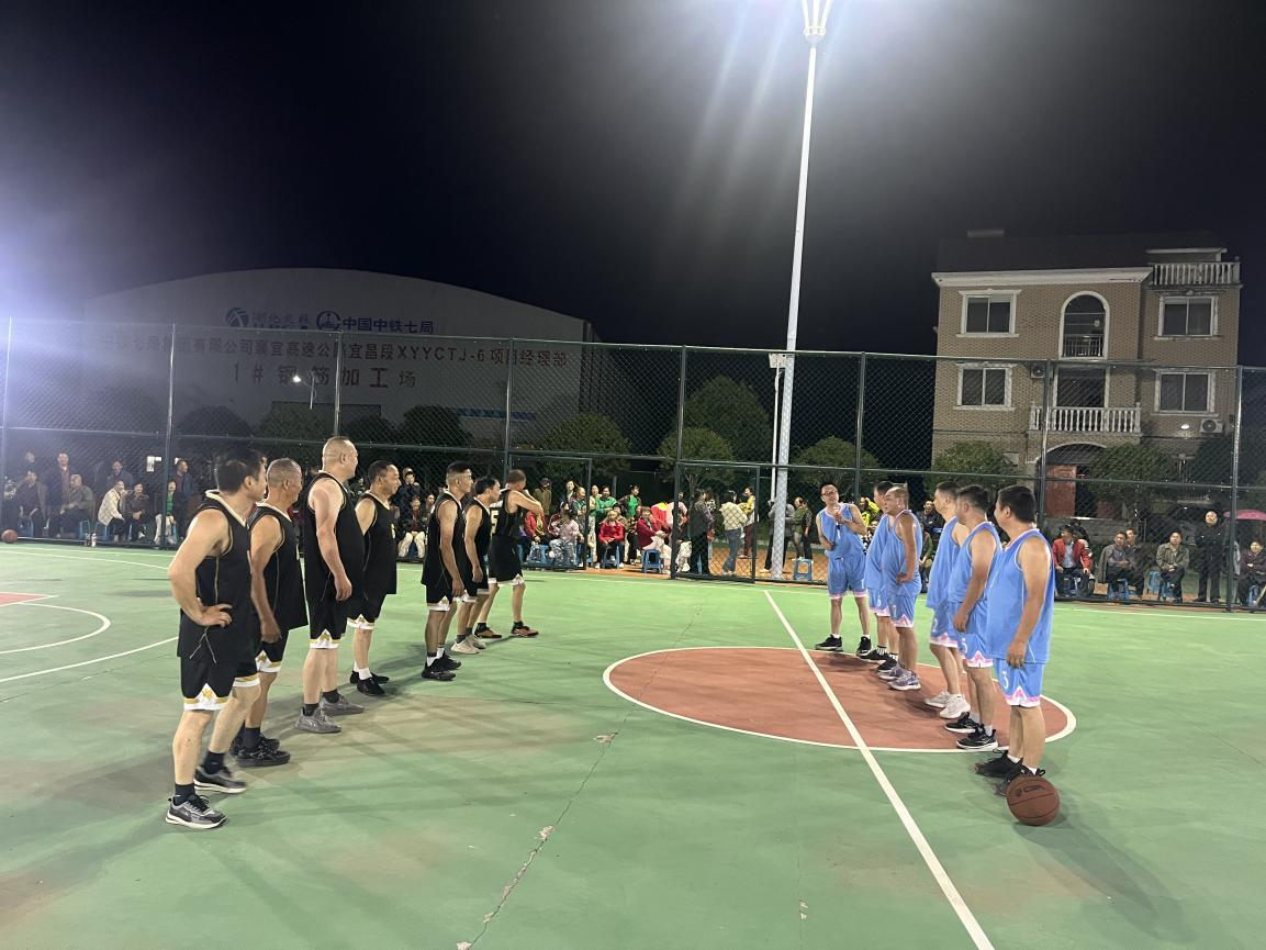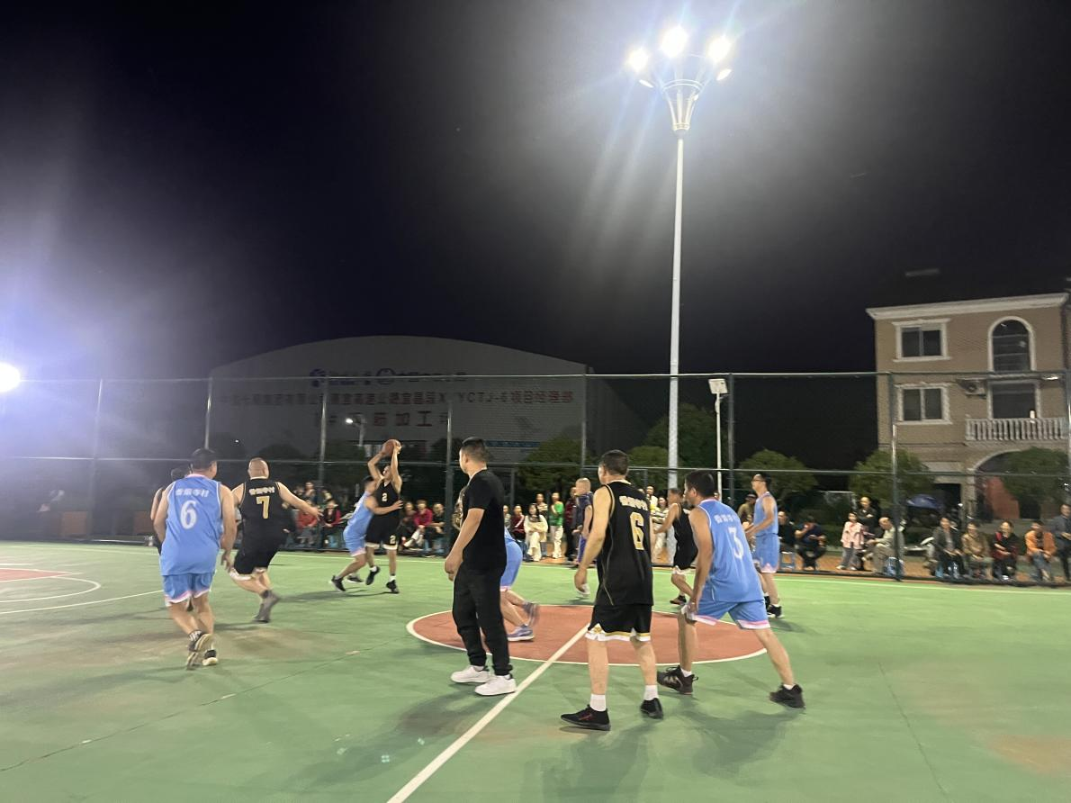 篮球场上,人头攒动,加油声、欢呼声此起彼伏,气氛热烈。比赛由村干部组成的蓝队与村民代表组成的黑队同场竞技,球员们精准投篮、巧妙传球和顽强防守,赢得观众喝彩。