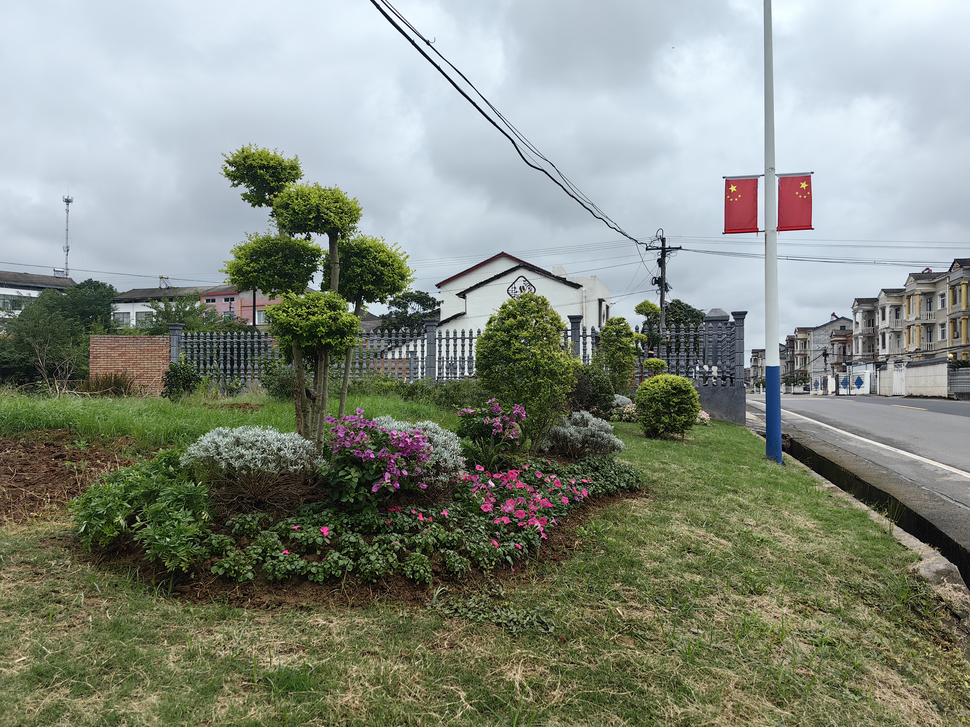 9月20日起,村委会组织党员群众志愿者对汉宜路金和段、董海路、蔬菜产业园沿线及村民文化广场进行环境卫生清扫,村委会采购500多面国旗在路灯杆上同步装饰,成为一道流动的风景线。党员志愿者带头,在村内绿化节点种植各色三角梅1000余株,形成3处国庆花景打卡点,吸引村民拍照留念。