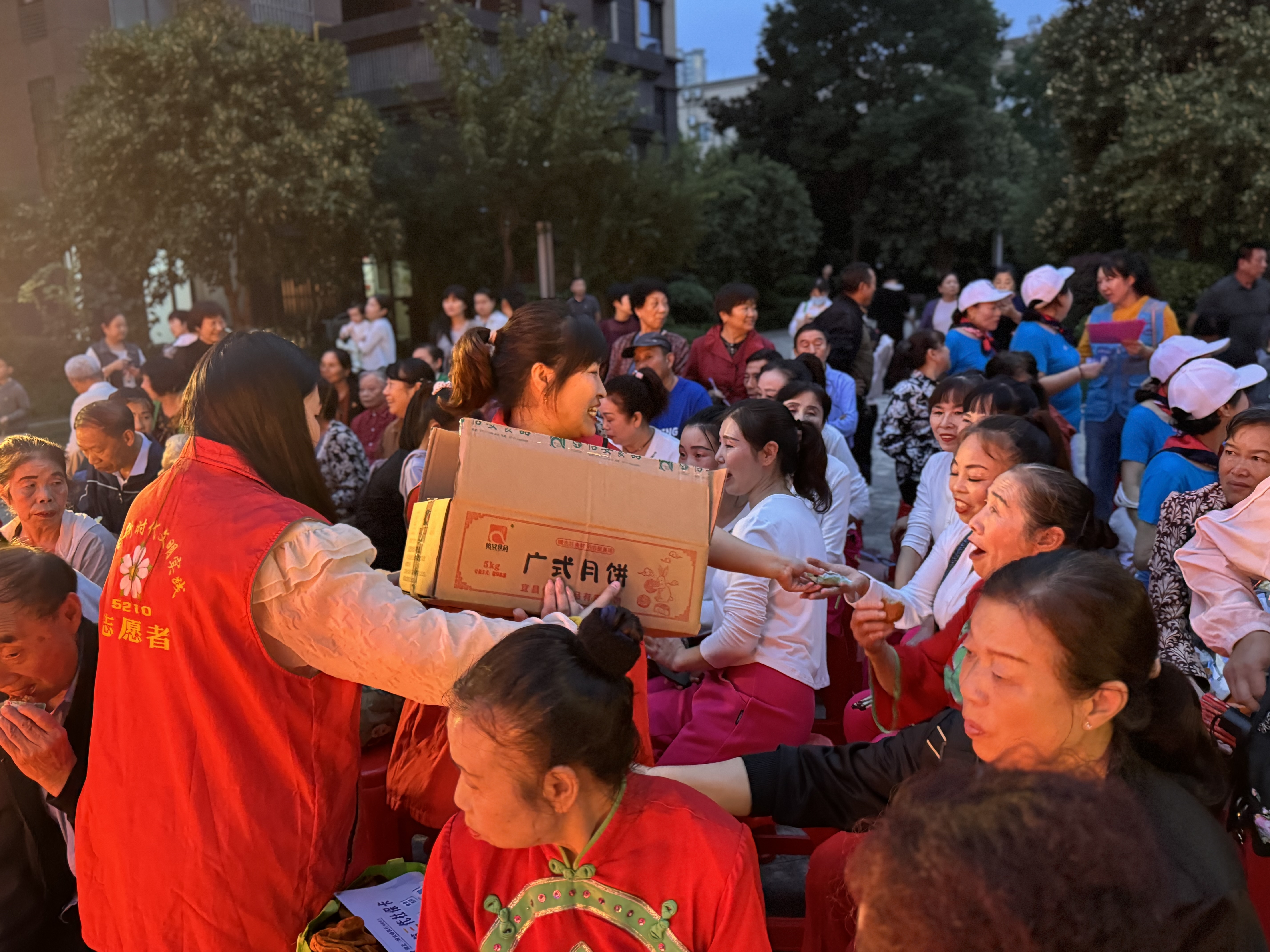 除了丰富多彩的文艺演出,晚会还设置了“月饼分享”环节。社区工作人员将提前准备好的月饼分发给在场的居民,大家一边品尝香甜的月饼,一边欣赏精彩节目,现场洋溢着温馨和谐的节日氛围,邻里之情在欢声笑语中悄然升华。