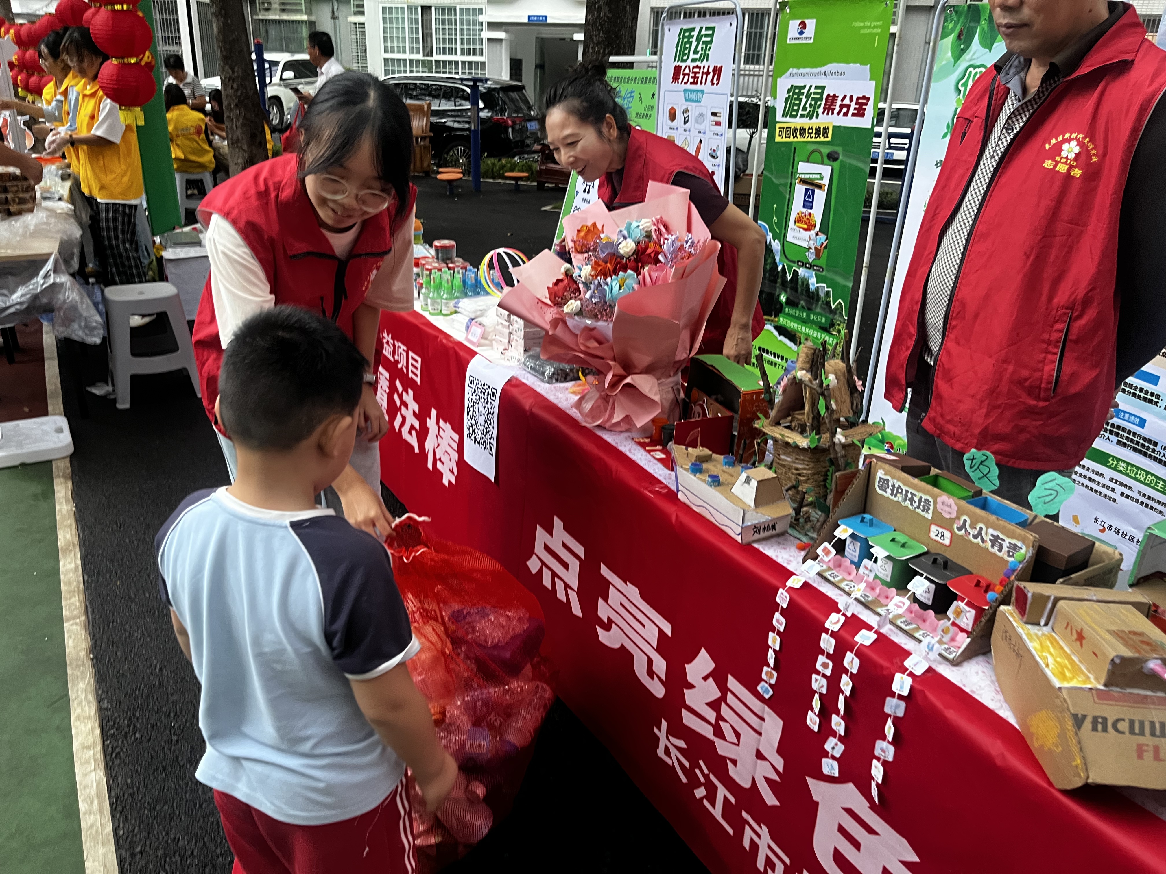 现场,“垃圾分类快闪剧”上演,居民们看得津津有味。循绿集分宝可回收物积分兑换活动中,参与兑换的环保手作摊位热火朝天,孩子们拉着家长一起“来上分”。亲子家庭把奶茶杯改造成“迷你花盆”,种下多肉,带走“绿色希望”。