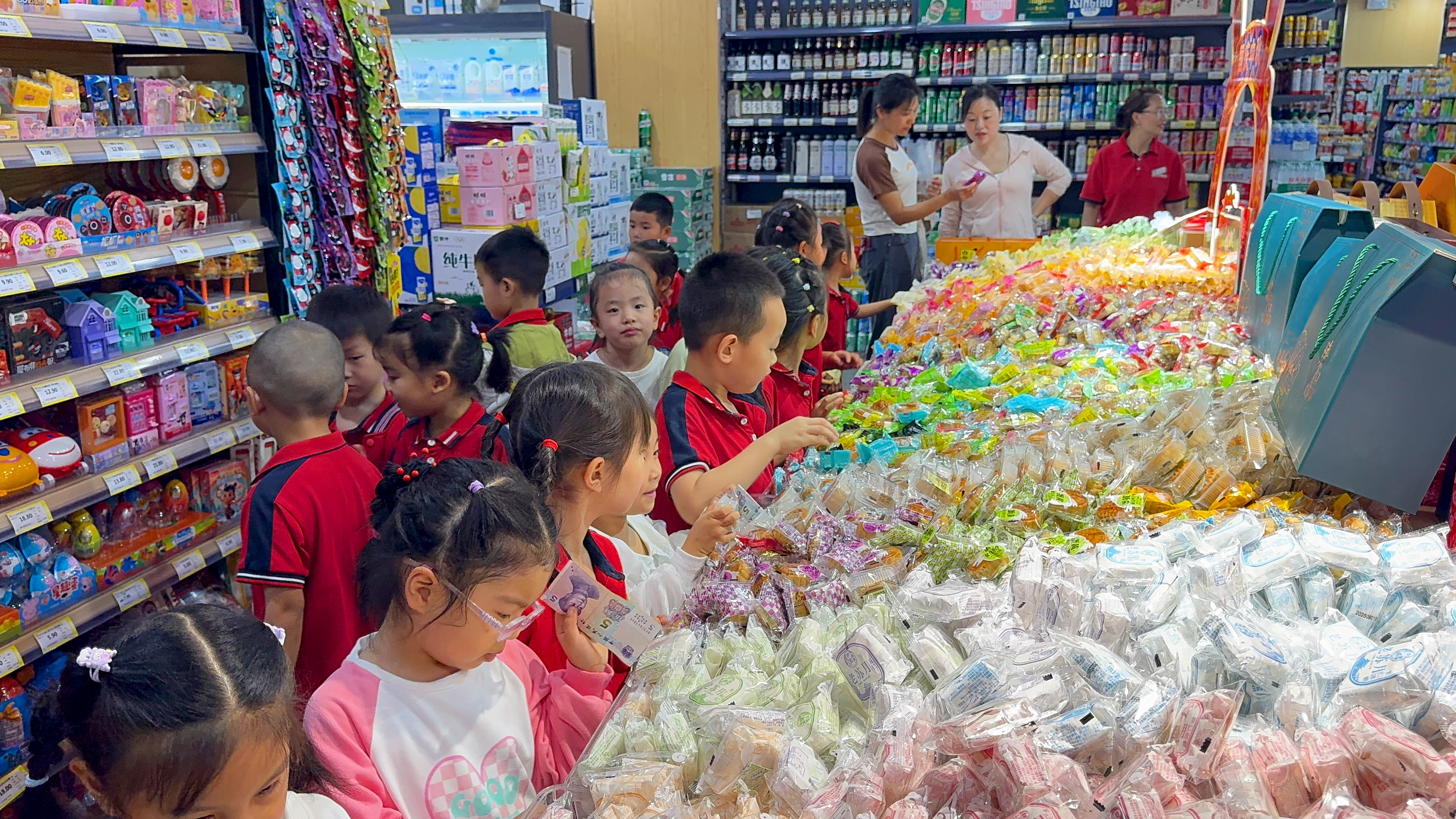 活动当天,孩子们先在教师引导下参观超市,了解物品分区、价格认读等常识;随后聚焦月饼展台,搜寻玉兔、月亮等中秋元素,观察月饼种类与价格;最后手持零花钱自主选购,在排队结算中实践社交与决策能力,真切感受生活中的数学价值。