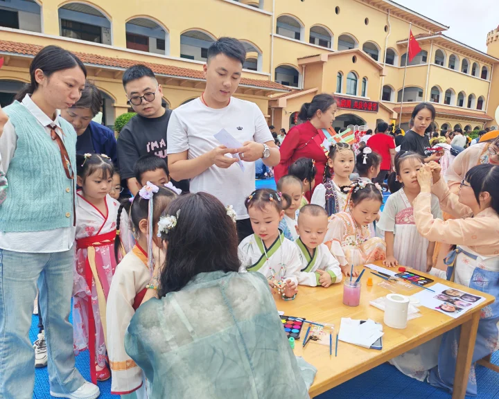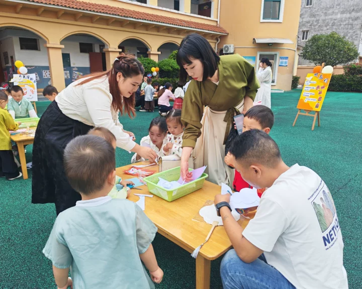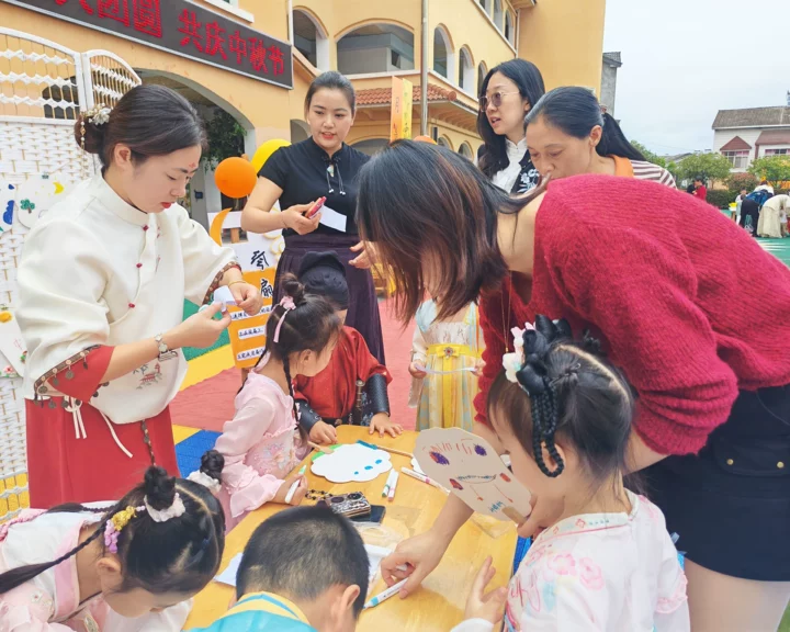 教师们的古典群舞翩若惊鸿,将气氛推向高潮。最热闹的当属亲子游园会,八大互动游戏同步开放:“月绘俏容颜”绘出童真,“手绘团扇”扇动诗意,“月下灯谜会”启迪智慧,还有“玉兔穿新衣”“做花灯”等趣味项目,让家长与孩子在巧手协作中感受非遗魅力,现场欢声笑语不绝。