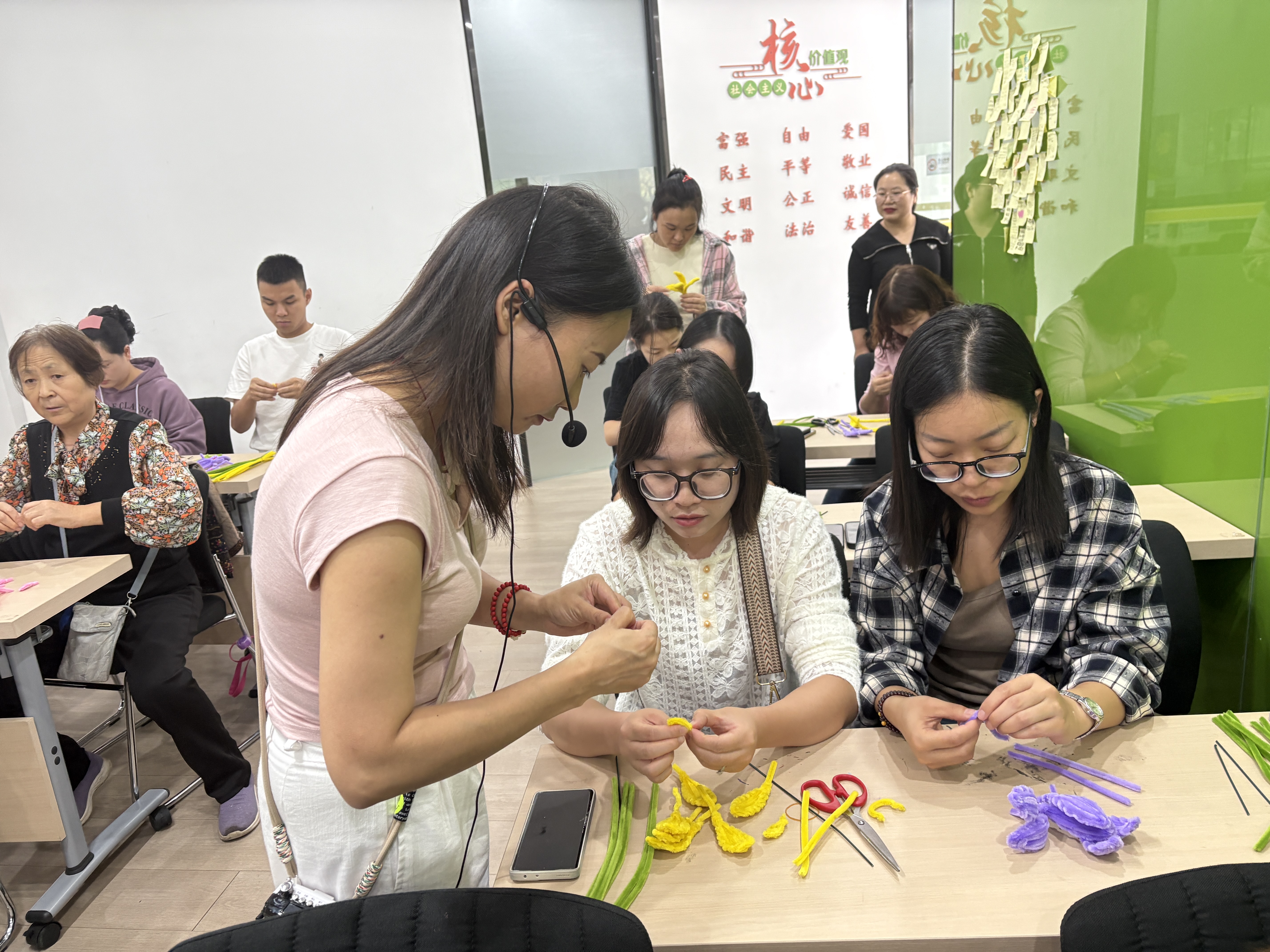 活动开始前,老师耐心讲解制作步骤,从花瓣的卷曲、花芯的固定,到花茎的组合,每一步都细致示范。居民们认真聆听、同步尝试,还主动交流技巧、互帮互助,不仅提升了手工技能,更在互动中打破邻里隔阂,筑牢了基层治理的“邻里情感纽带”。