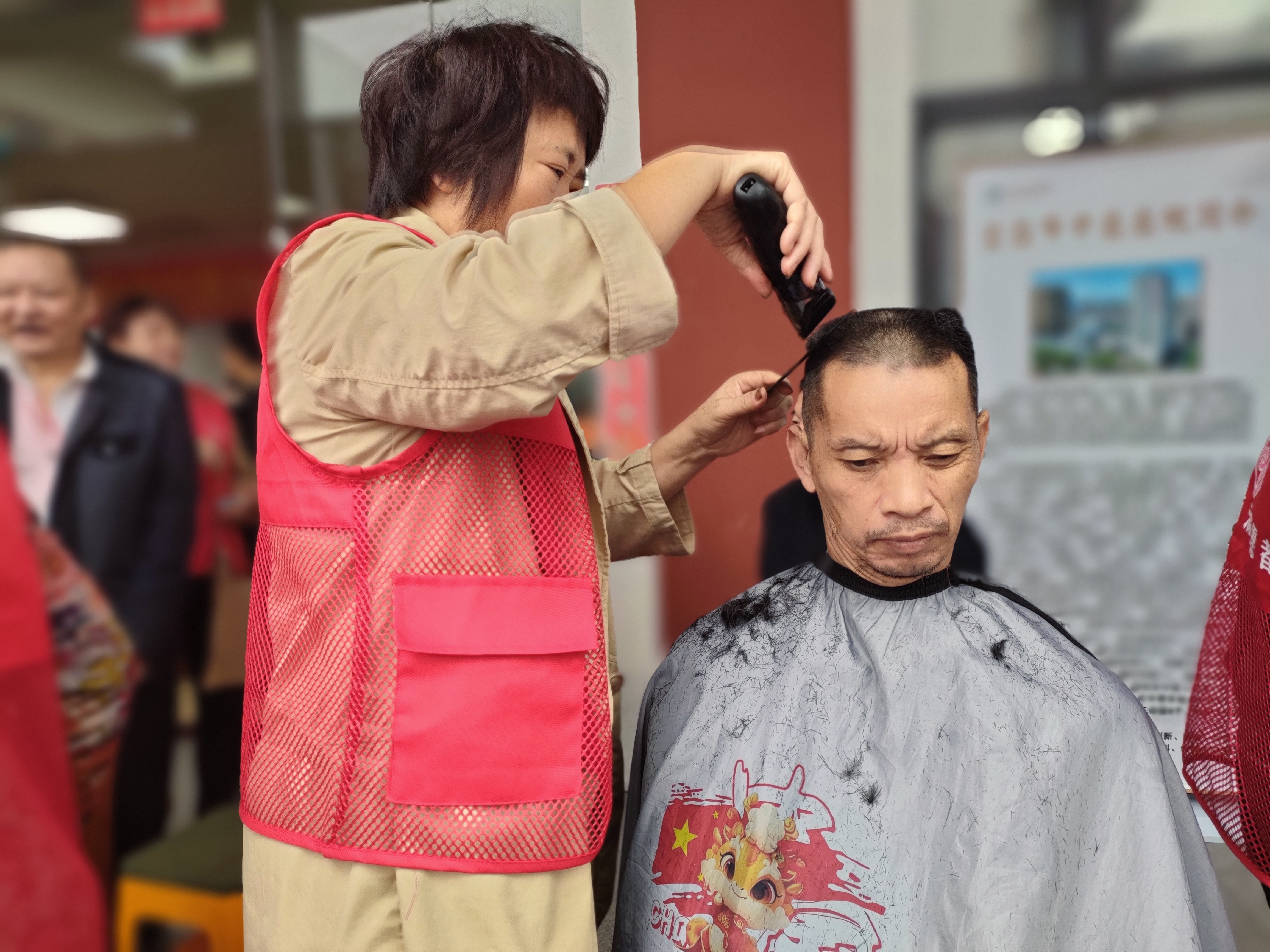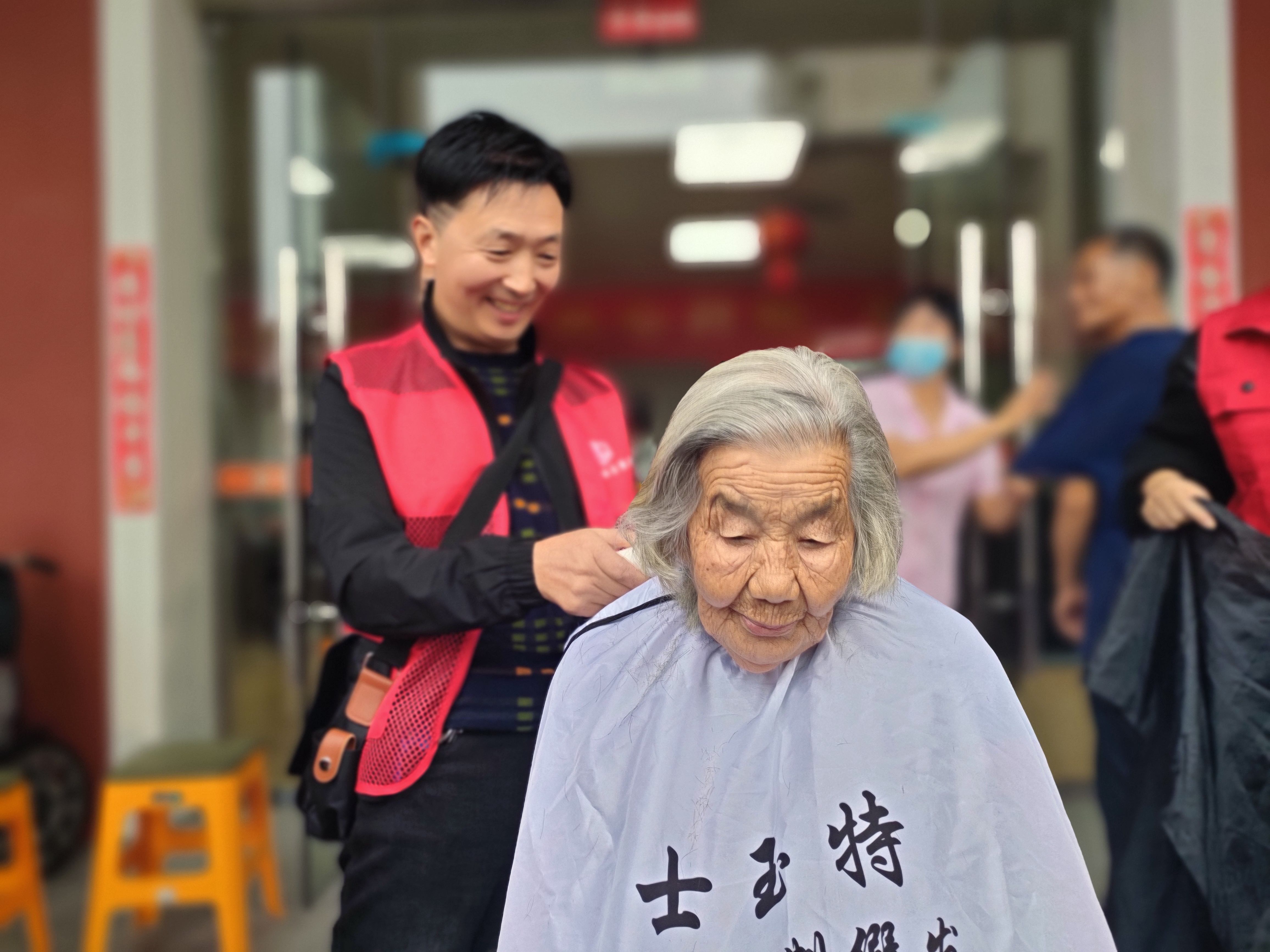活动伊始,花雨社工的志愿者们便早早来到现场,利落地支起工作台,摆好剪刀、推子等工具。理发区很快便吸引了众多老人,不一会儿就排起了长长的队伍。服务过程中,志愿者们一边耐心与老人沟通喜好,一边细致地进行修剪。看着镜中焕然一新的发型,老人纷纷称赞道:“剪得真好,整个人都精神多了!”