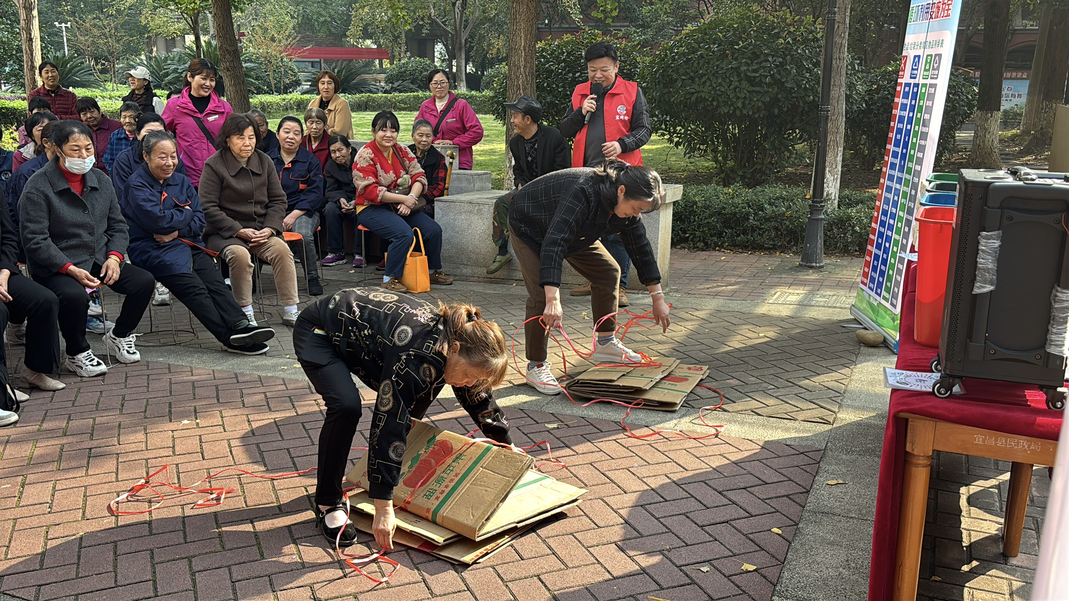 打包比赛现场,居民们尽显“打包神技”!原本零散杂乱的可回收物,经大家的规整,瞬间变得井然有序。