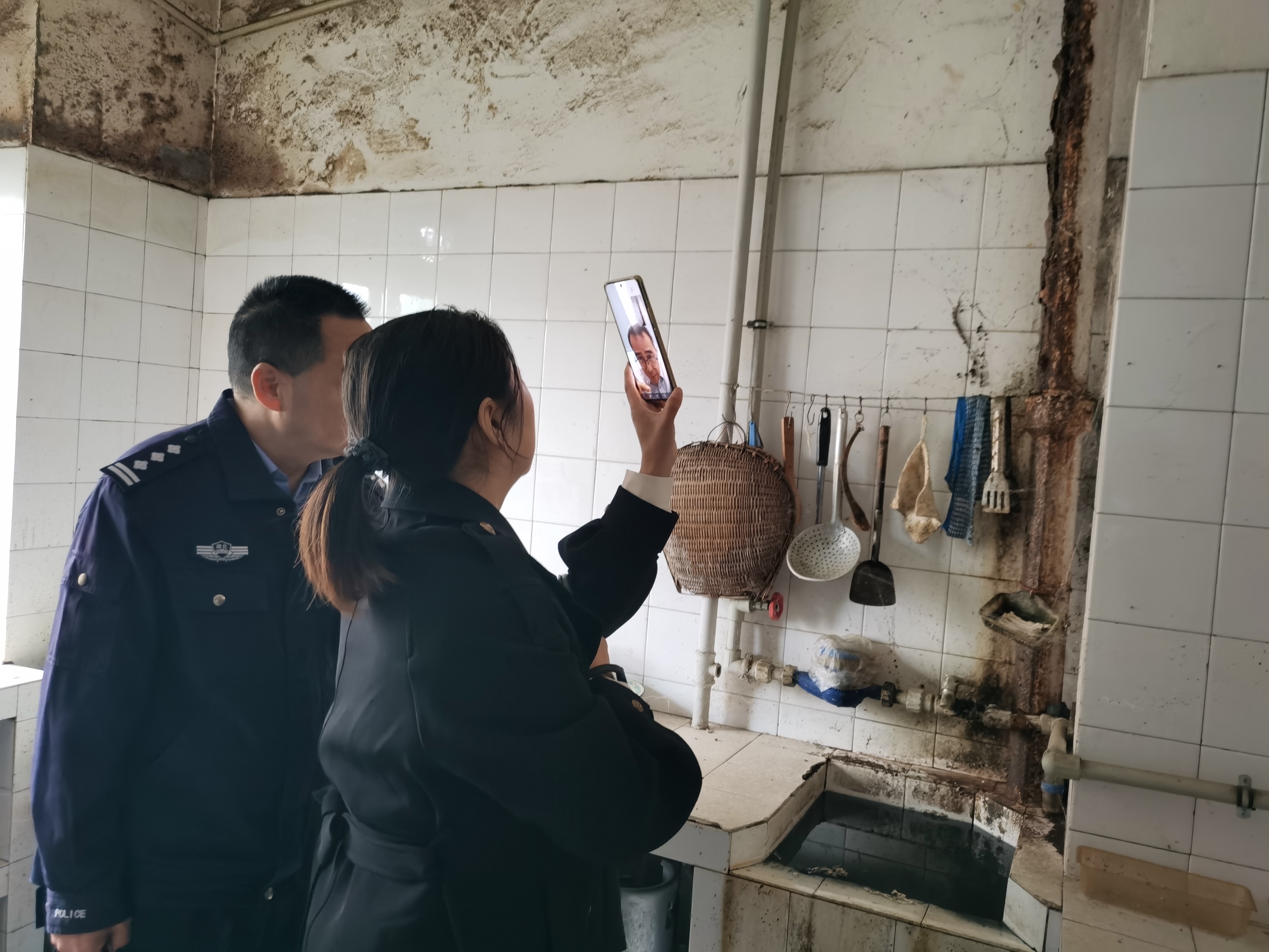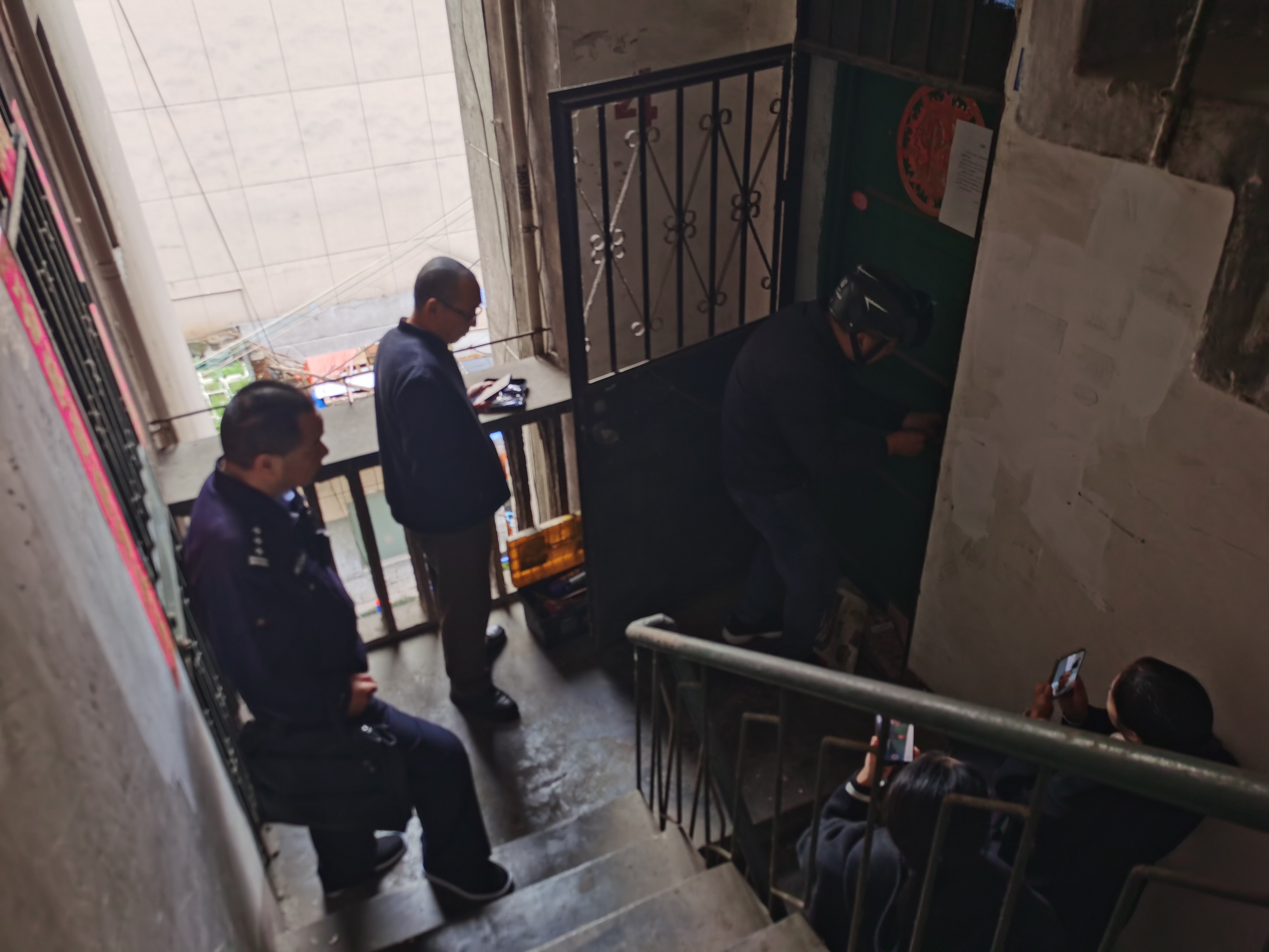 得到姚奶奶的授权后,小郑第一时间向社区党委书记汇报。为保障居民隐私与财产安全,社区干部与小郑联动社区民警代警官,共同前往现场。在民警的执法记录仪的监督见证下,开锁师傅顺利开门,小郑全程与姚奶奶的儿子视频连线,确保透明处理。进入室内后,她发现水声来自厨房一根破裂的水管,积水已渗入楼下,情况不容乐观。