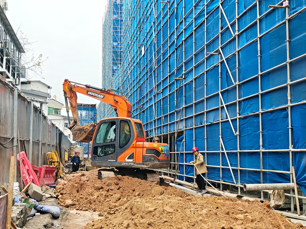 11月10日,走进夷陵区三巷天和农贸危旧房改造项目现场,挖掘机正挥舞铁臂进行土方回填,施工人员忙着室内二次结构施工和楼板模板安装,机器轰鸣声和工人作业声交织,一派热火朝天的建设景象。作为宜昌市级危旧房改造试点扩面项目,这片承载着夷陵人记忆的区域,正加速蜕变为融合居住、商业、休闲等多元功能的现代化社区。