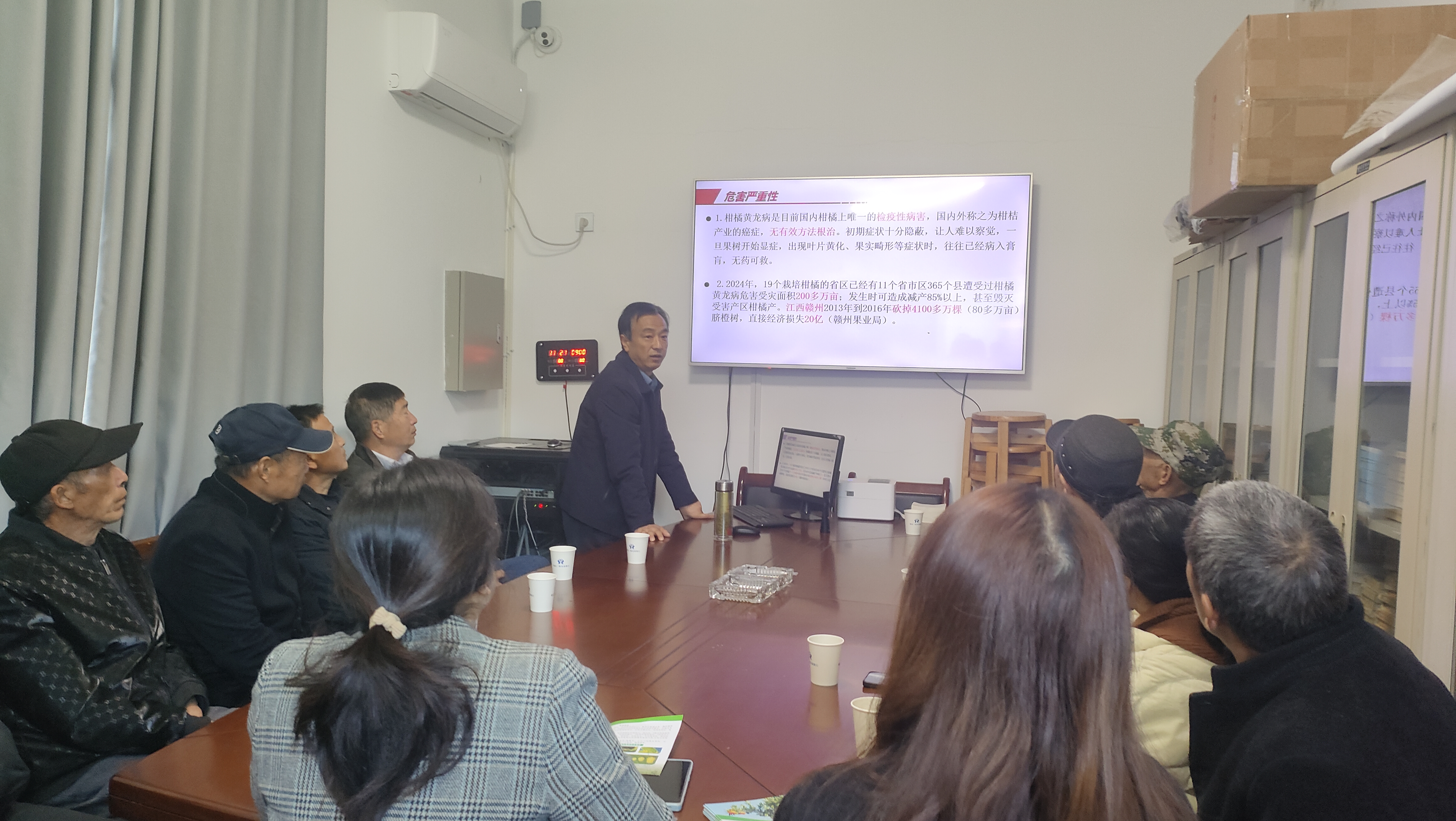 11月21日,小溪塔街道农业农村服务中心工作人员受邀前往文仙洞村,结合党员代表会开展柑橘黄龙病防控专题宣讲,村“两委”干部、党员代表及种植大户参加。