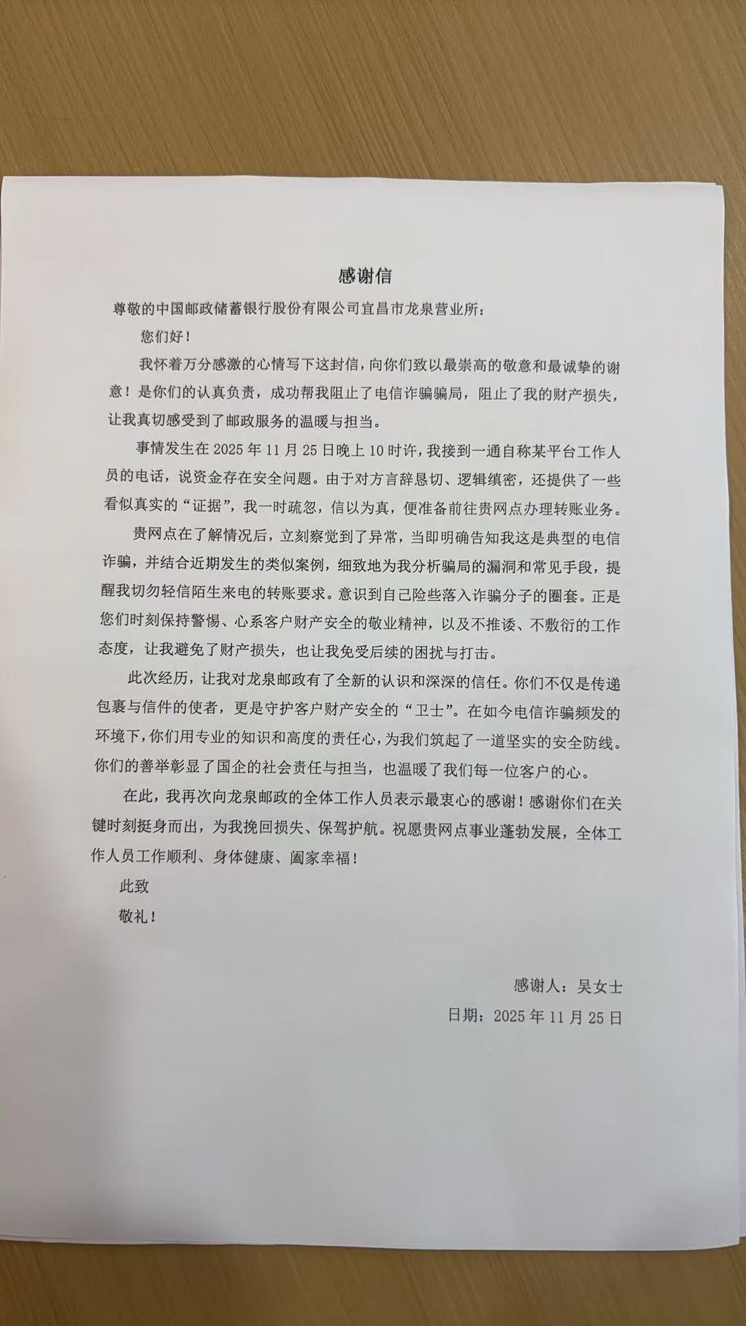 “真的太感谢你们了!要是没有你们,我这辈子的积蓄就都没了!”11月25日,夷陵区邮政公司龙泉邮政支局大厅内,市民吴女士手捧一面印有“反诈先锋守财富 邮政担当护平安”的锦旗和一封饱含深情的感谢信,交到网点工作人员手中,言语中满是感激与动容。