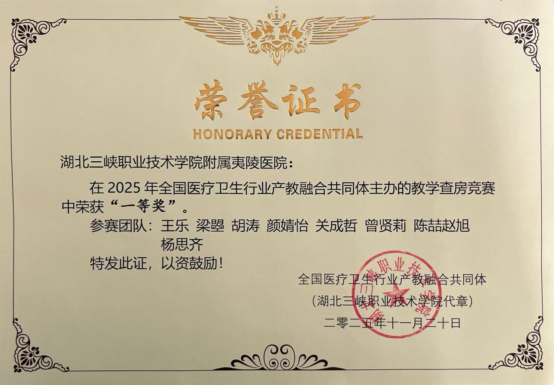 近日,在全国医疗卫生行业产教融合共同体教学查房竞赛暨临床医学专业(群)专兼职教师数智赋能会议活动中,夷陵人民医院参赛指导老师王乐带领团队在教学查房竞赛中斩获全国一等奖的优异成绩。