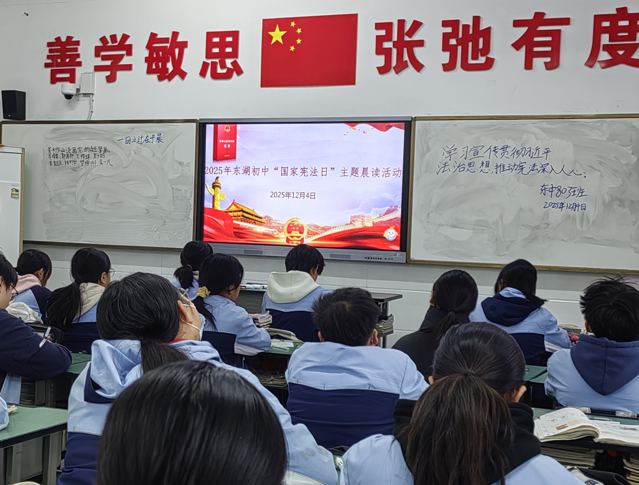今年12月4日是第十二个国家宪法日。东湖初中利用课间操时间,通过校园视频系统开展“国家宪法日”主题晨读活动。