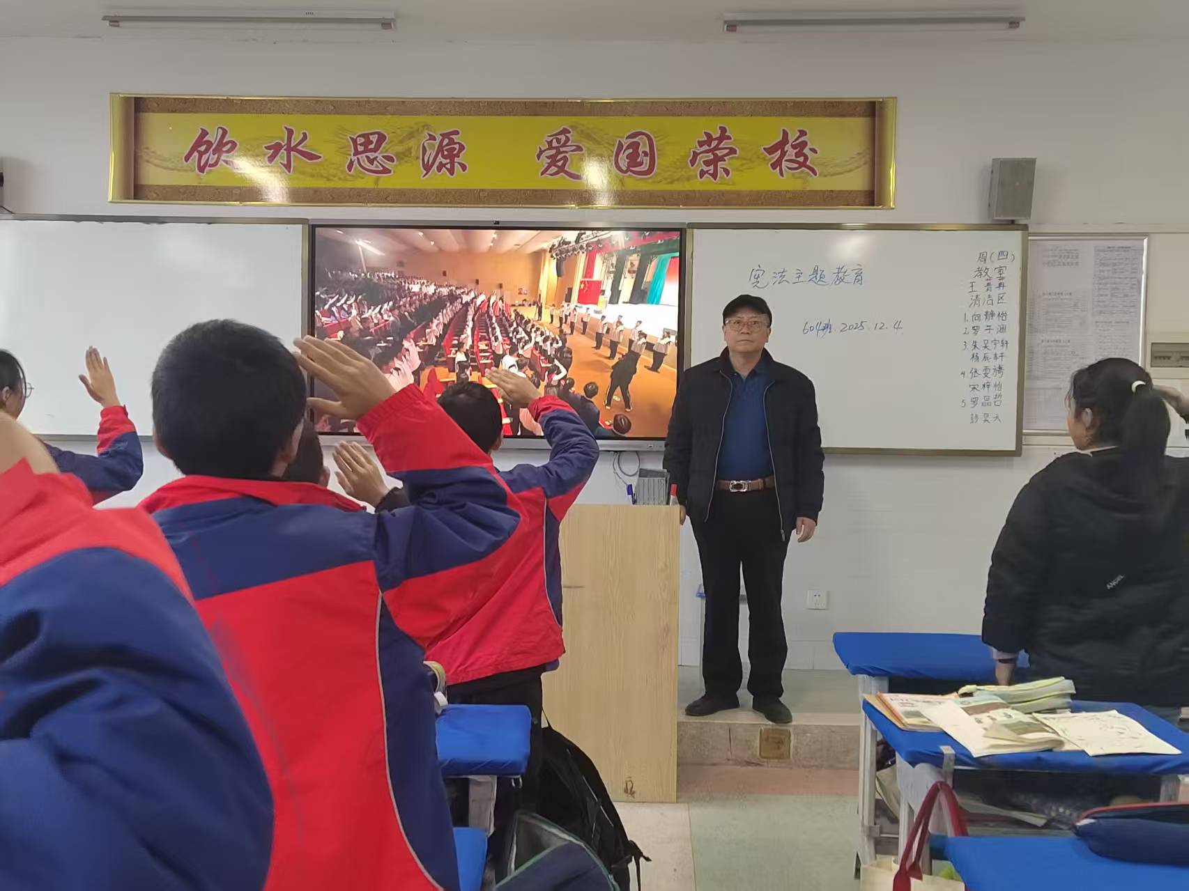活动期间,学校将宪法学习融入日常教学环节。早自习时段,各班班主任借助生动形象的图片、PPT课件和普法视频,向学生系统讲解宪法的起源、核心内涵及学习宪法的重要意义,引导学生深刻理解“尊崇宪法、学习宪法、遵守宪法、维护宪法、运用宪法”的重要性,鼓励大家争做知法懂法的守法小公民。课间操时间,全校师生集中观看教育部全国青少年普法网宪法晨读直播,跟随直播节奏齐声诵读宪法条文,在朗朗书声中感受宪法的庄严与权威。