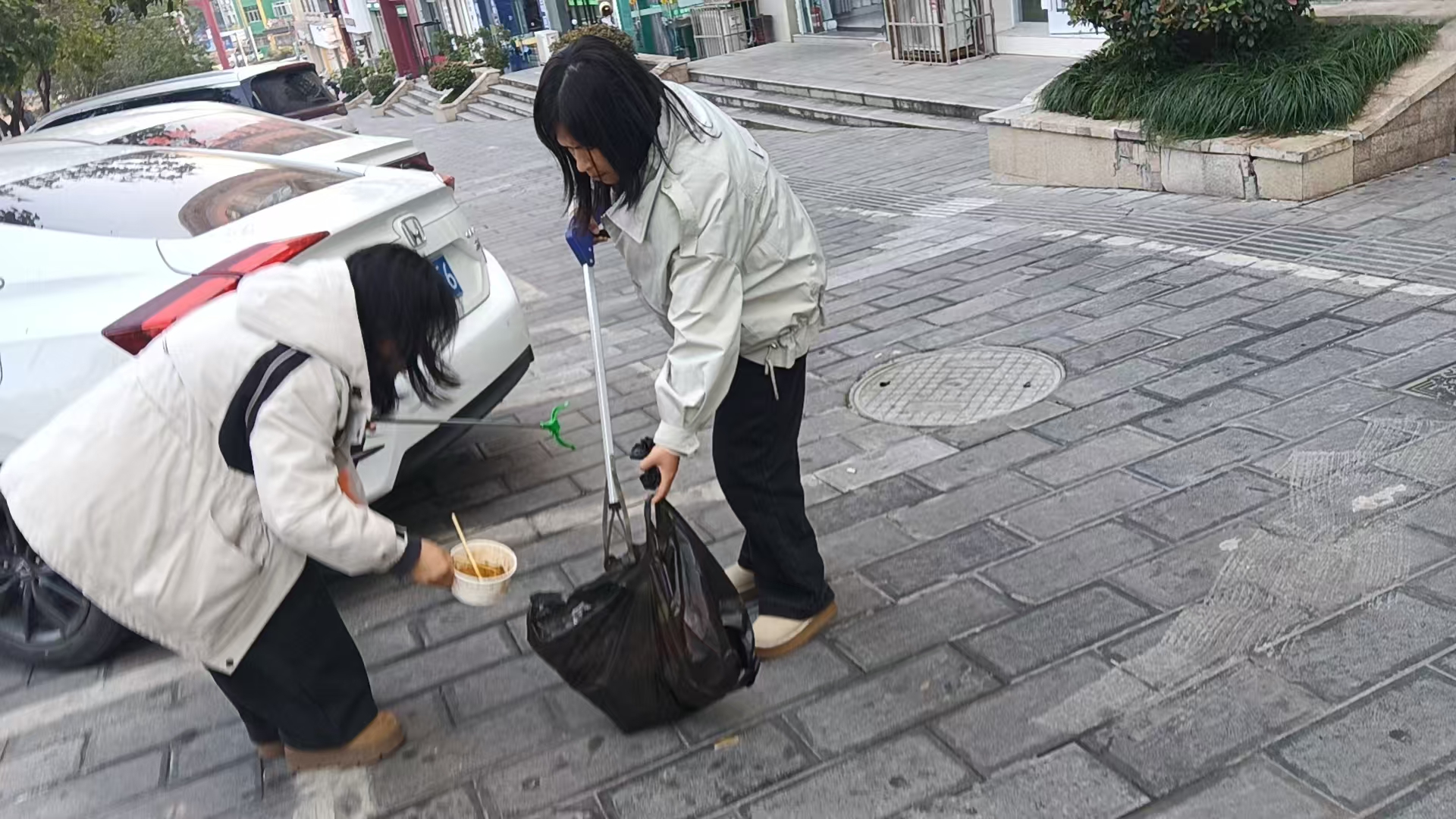 扫帚起落,落叶归拢;夹钳轻拾,纸屑入袋。转角垃圾桶被细心擦拭,楼道杂物被有序清运。