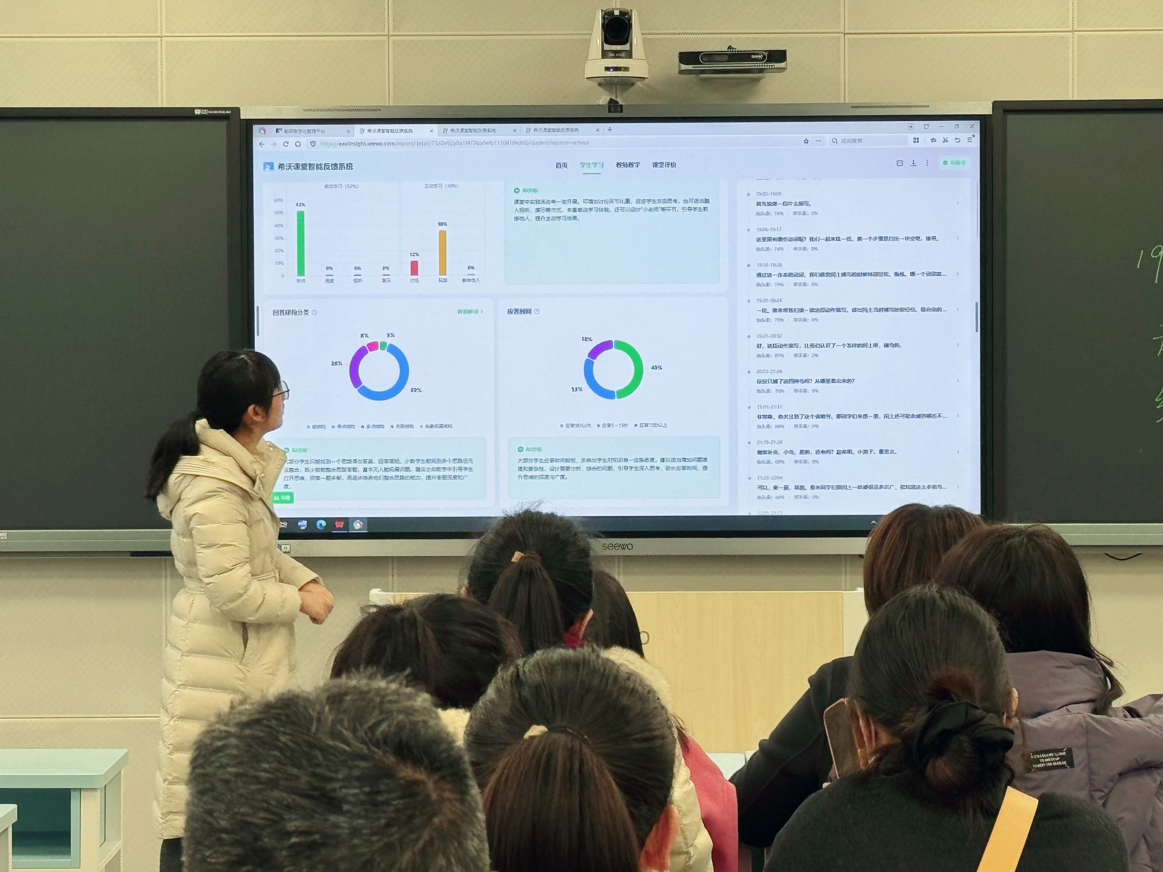 活动中,24名教师围绕“生动课堂”理念,立足学情,精心设计教学环节,展现扎实的教学功底与课堂创新意识。研讨环节中,各学科组借助智能评课系统生成的AI循证报告,结合人工观察记录,开展精准议课与反思,推动评课方式实现从“经验为主”向“实证支撑”的转变,提升了教研活动的针对性与实效性。