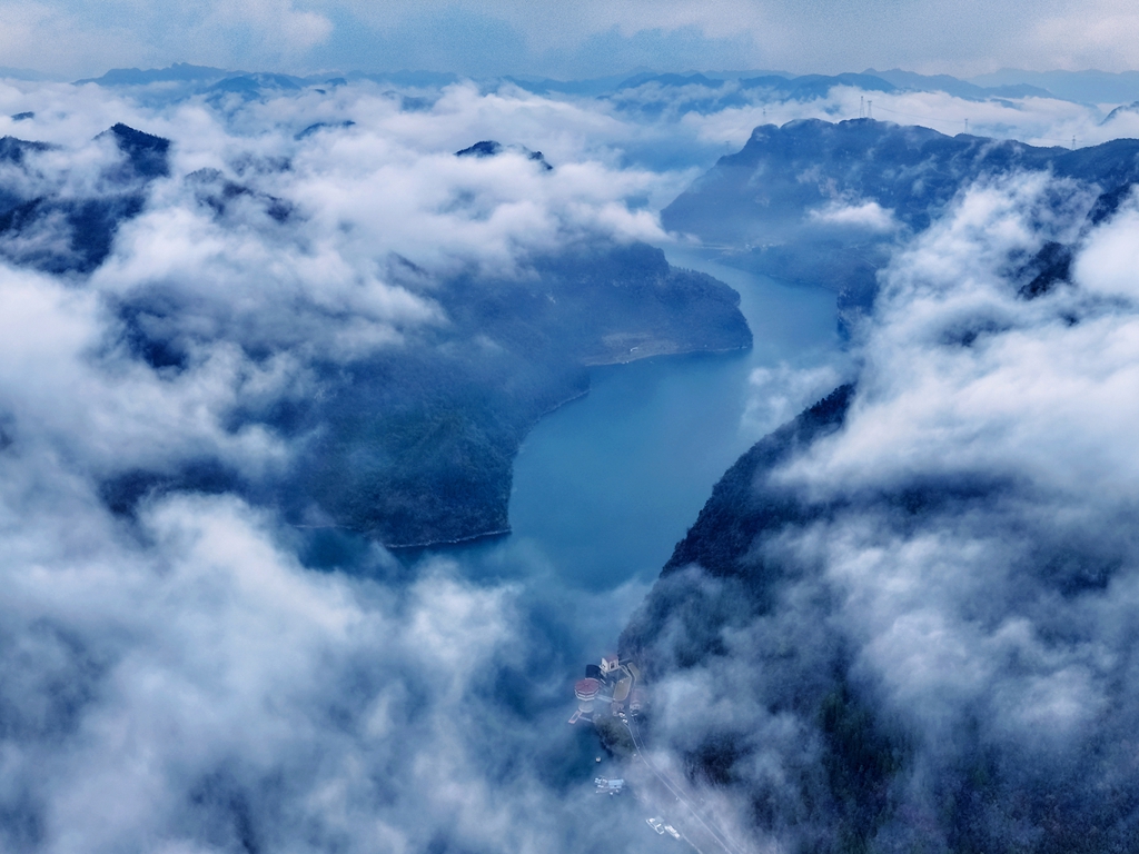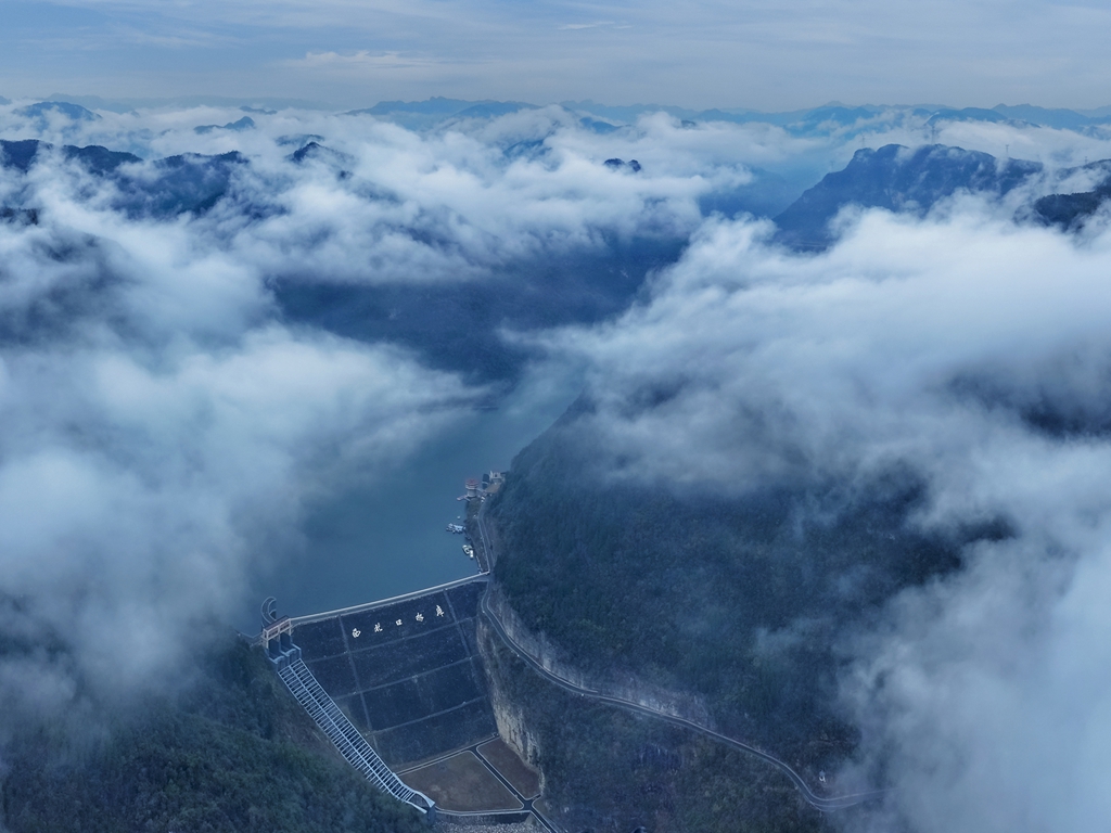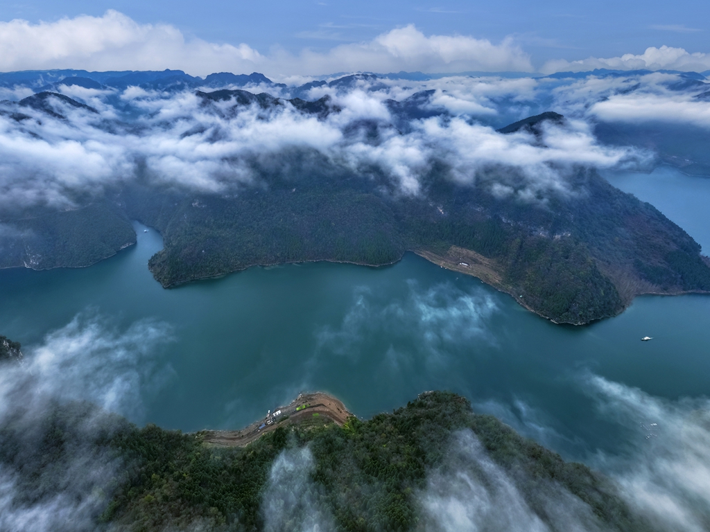 12月23日,夷陵区秋冬降雨过后,长江黄柏河西北口水库呈现罕见美景:两岸山顶被云海全覆盖,库区却碧波映山、岸绿景明,新能源水政执法船穿梭其间,提醒客渡船防范雾情风险,构成一幅壮美的山水画卷。