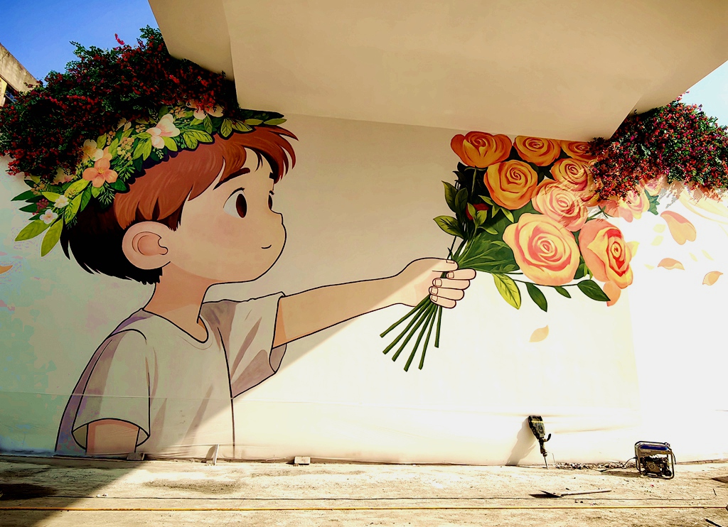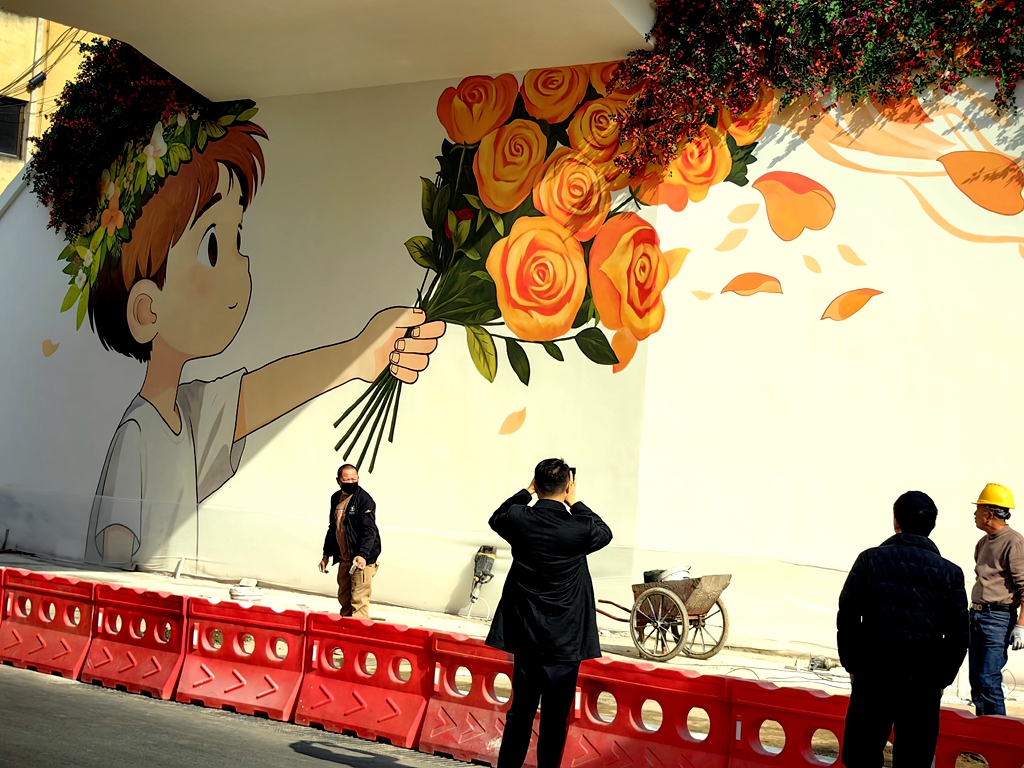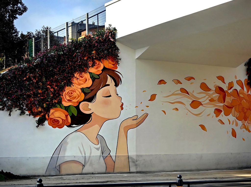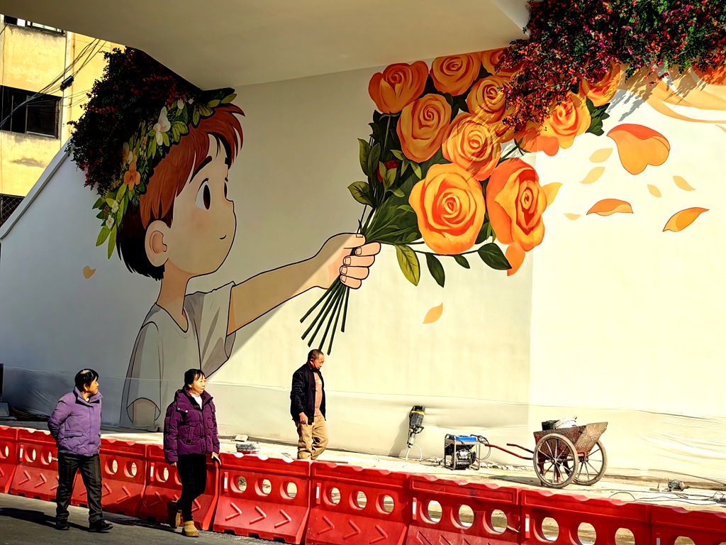 墙绘以细腻笔触勾勒出纯粹美好的场景:一边,头戴花环的小女孩轻闭眼眸,神情温婉,指尖凝香间,漫天花瓣如蝶翼般轻盈飘散,仿佛能嗅到空气中弥漫的清甜;另一边,同样头戴花环的小男孩手持一大束绚烂鲜花,花朵的色彩饱满欲滴,似要溢出墙面,将蓬勃生机传递给每一位路人。冷暖交织的色调、生动鲜活的形象,让冰冷的桥体瞬间拥有了温度与生命力。