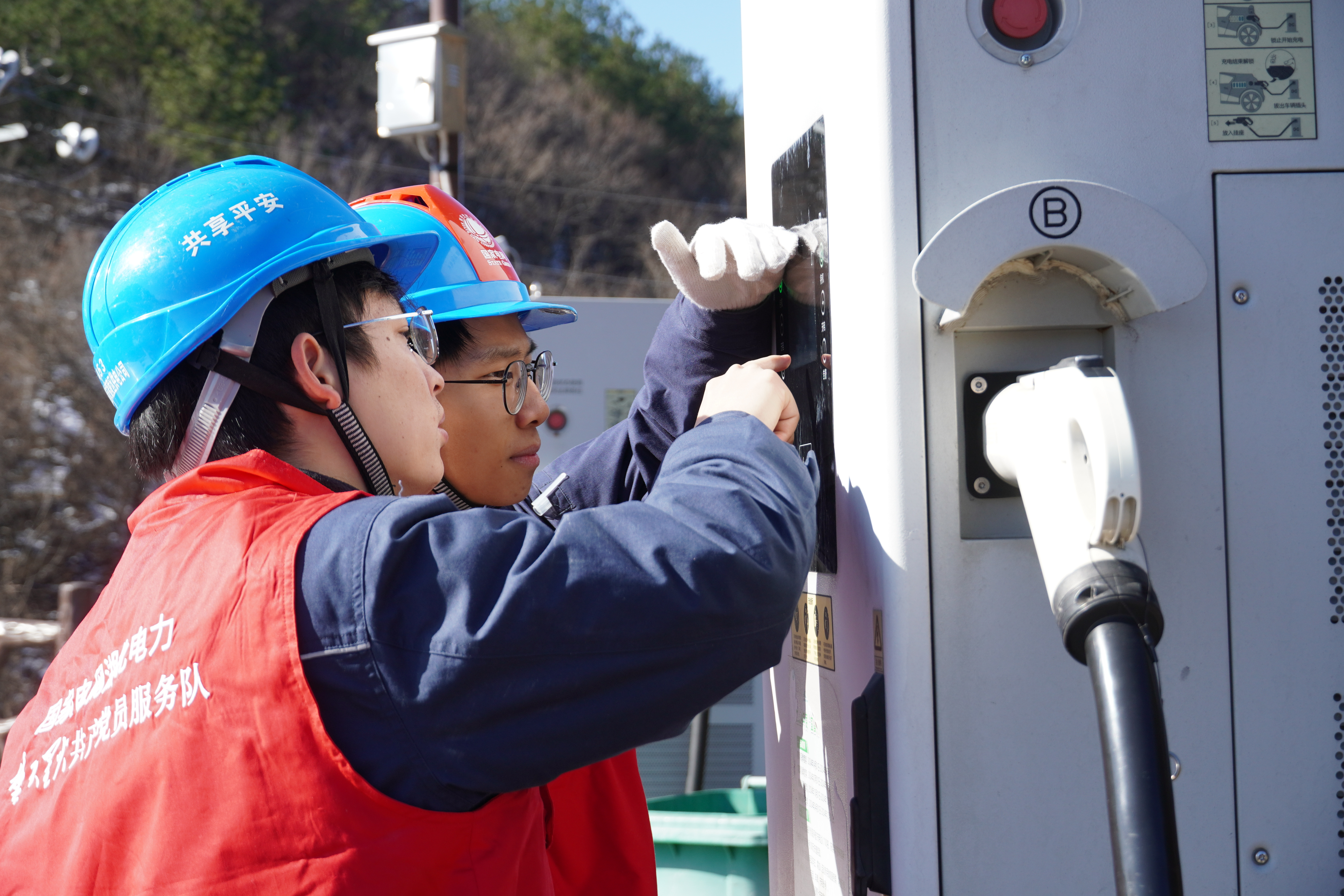 在景区南门新能源汽车充电站,二人细致检查了充电桩设备运行状态、电气连接及安全防护装置,测试了应急功能,确保旅游高峰期间充电服务安全高效,助力游客绿色出行。