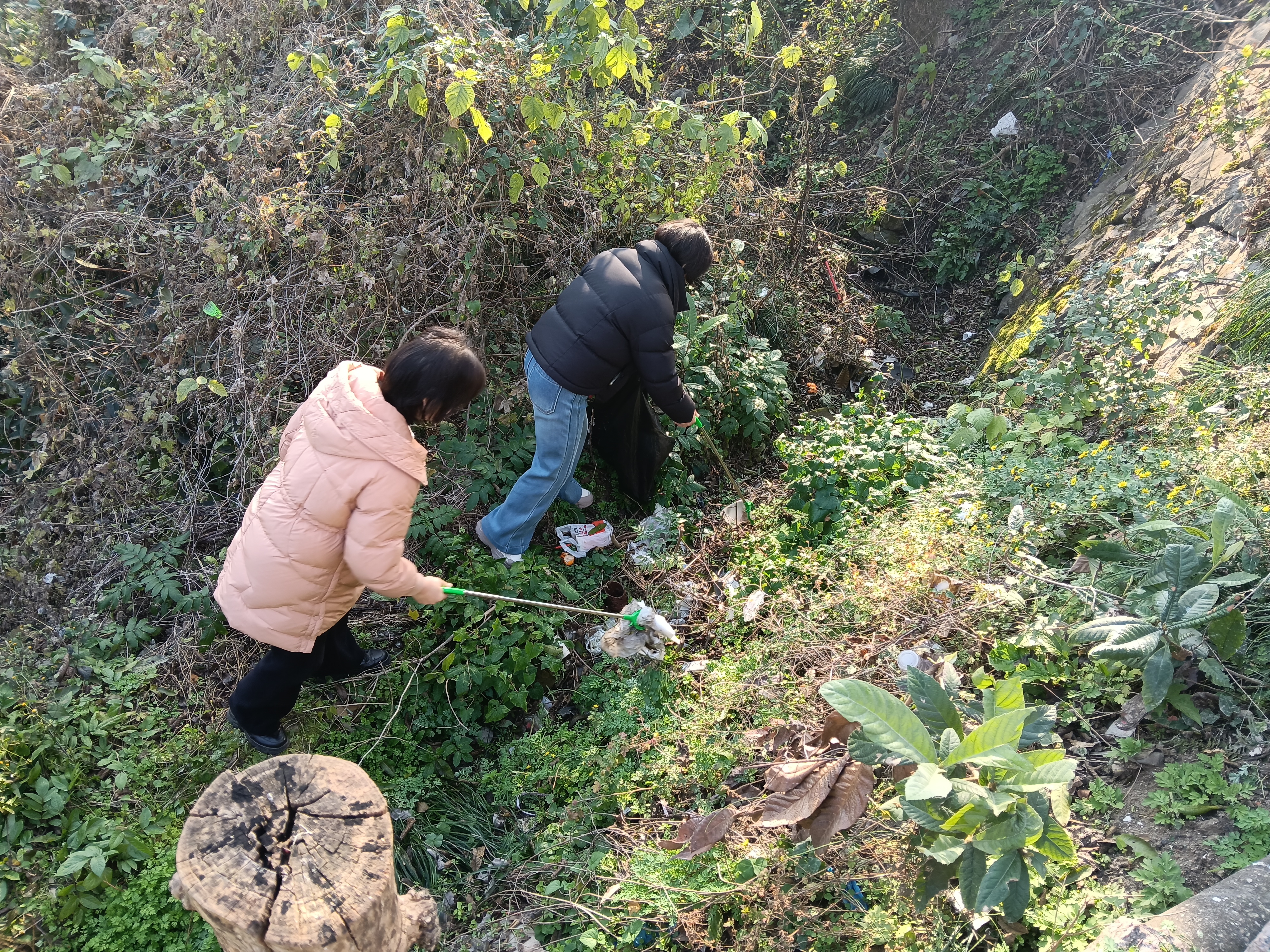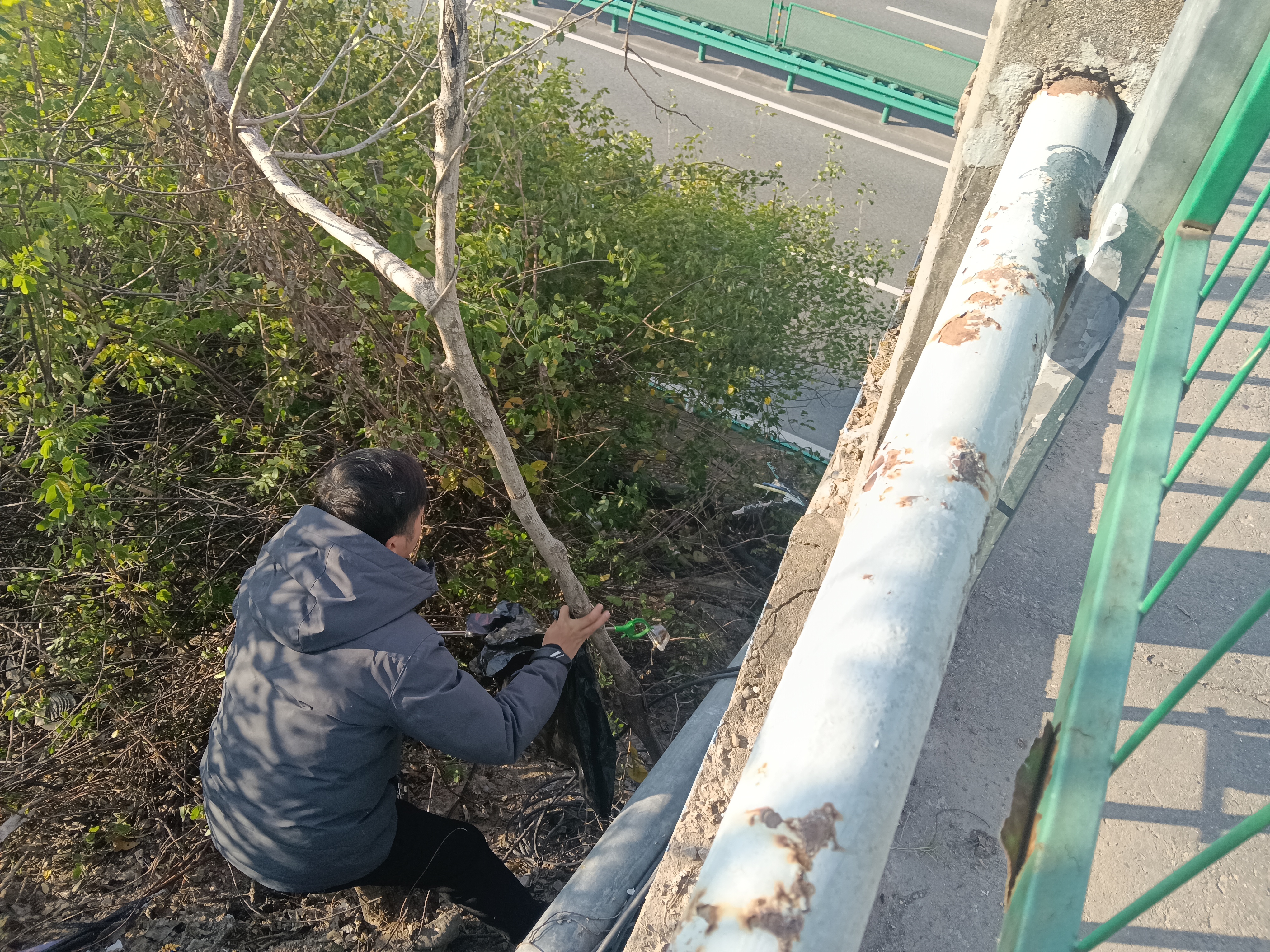面对高速旁坡地的杂草丛与隐藏其中的塑料瓶、食品包装袋、废旧杂物等垃圾,工作人员不顾地形复杂,小心攀爬并俯身将灌木丛深处的顽固垃圾和枇杷树下的卫生死角逐步清理。经过一番努力,原本杂乱的坡地和线缆旁被清理得干干净净,环境面貌得到明显改善。