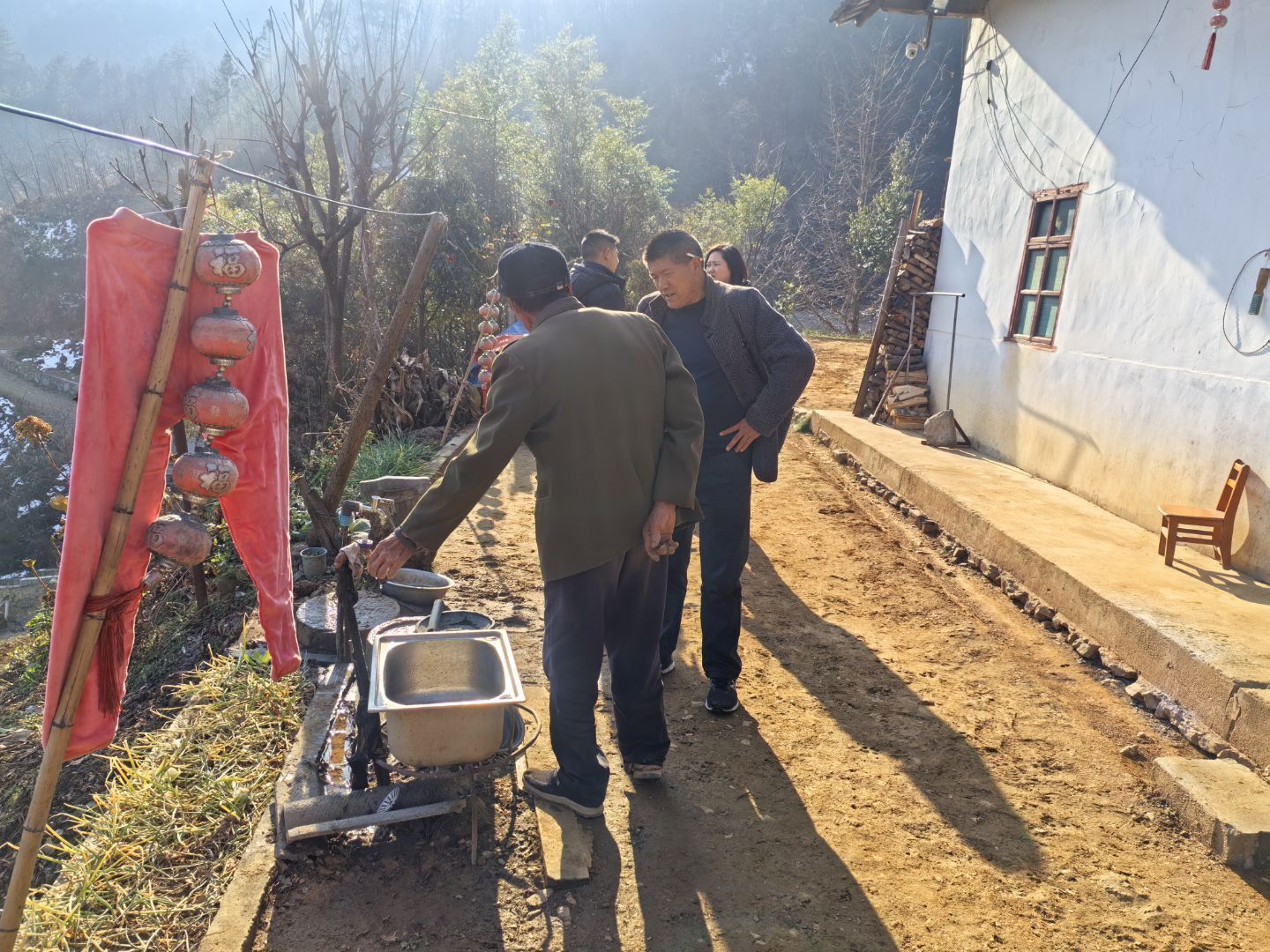 在走访三组时,了解到一位独居老人因家中水管埋设较浅被冻住,只能临时从溪沟引水,用水极不稳定。党支部书记李自红得知情况后,立即安排人员现场踏勘,制定方案,当天便为老人重新铺设好水管,并做好防冻处理,将处理达标的清洁水源直通厨房。
