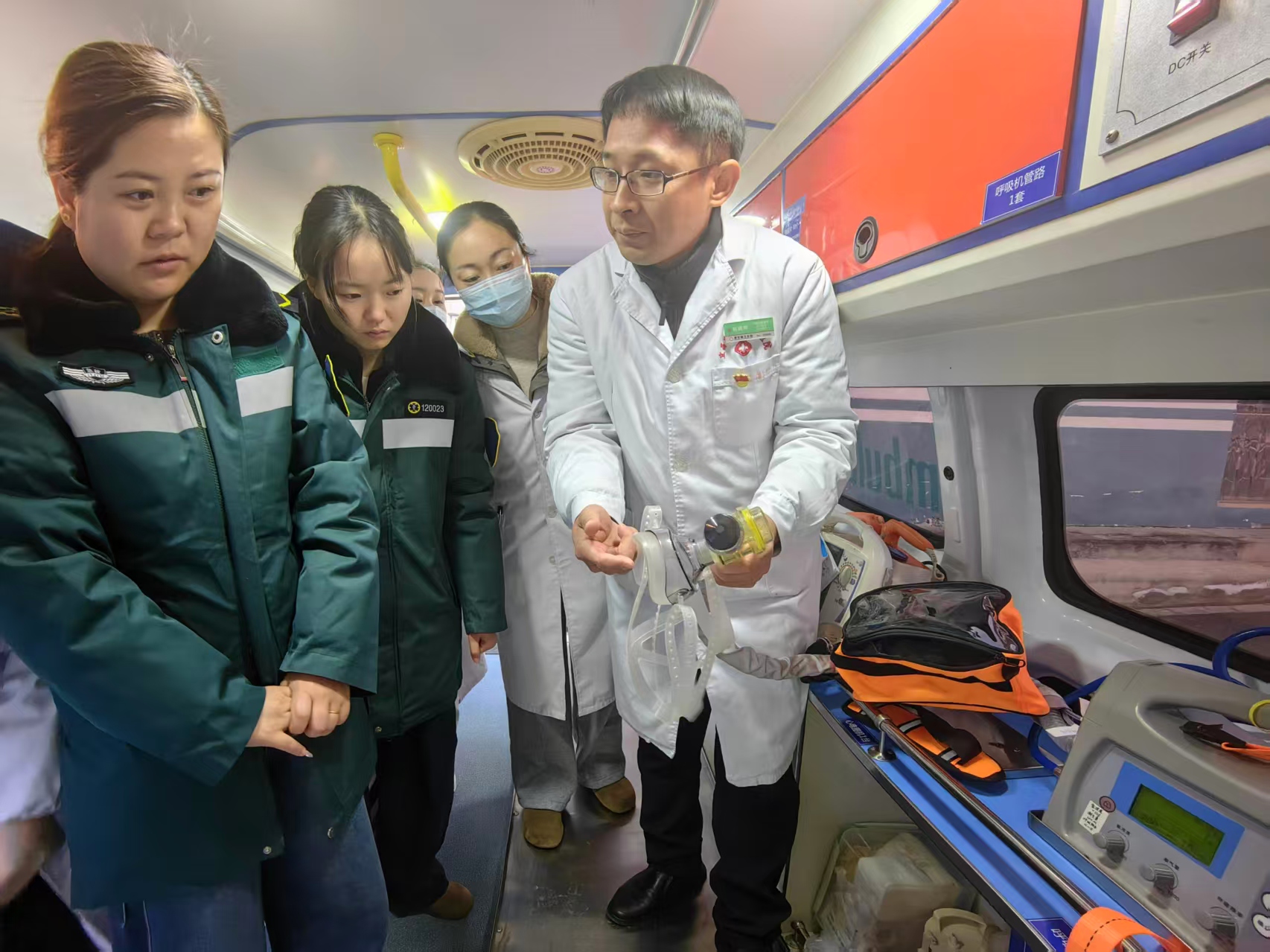 本次培训在120救护车内进行,以实操教学为核心,贴合院前急救的实际工作场景。培训中,针对车载呼吸机的参数调节、面罩佩戴,以及操作流程等关键内容进行了细致讲解,并现场演示了设备操作的标准步骤。参与培训的医护人员逐一上手实操,确保熟练掌握每一项操作要点。