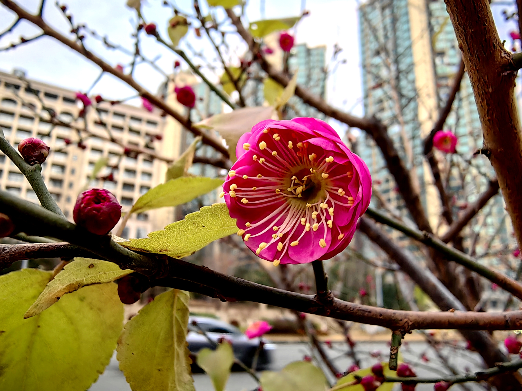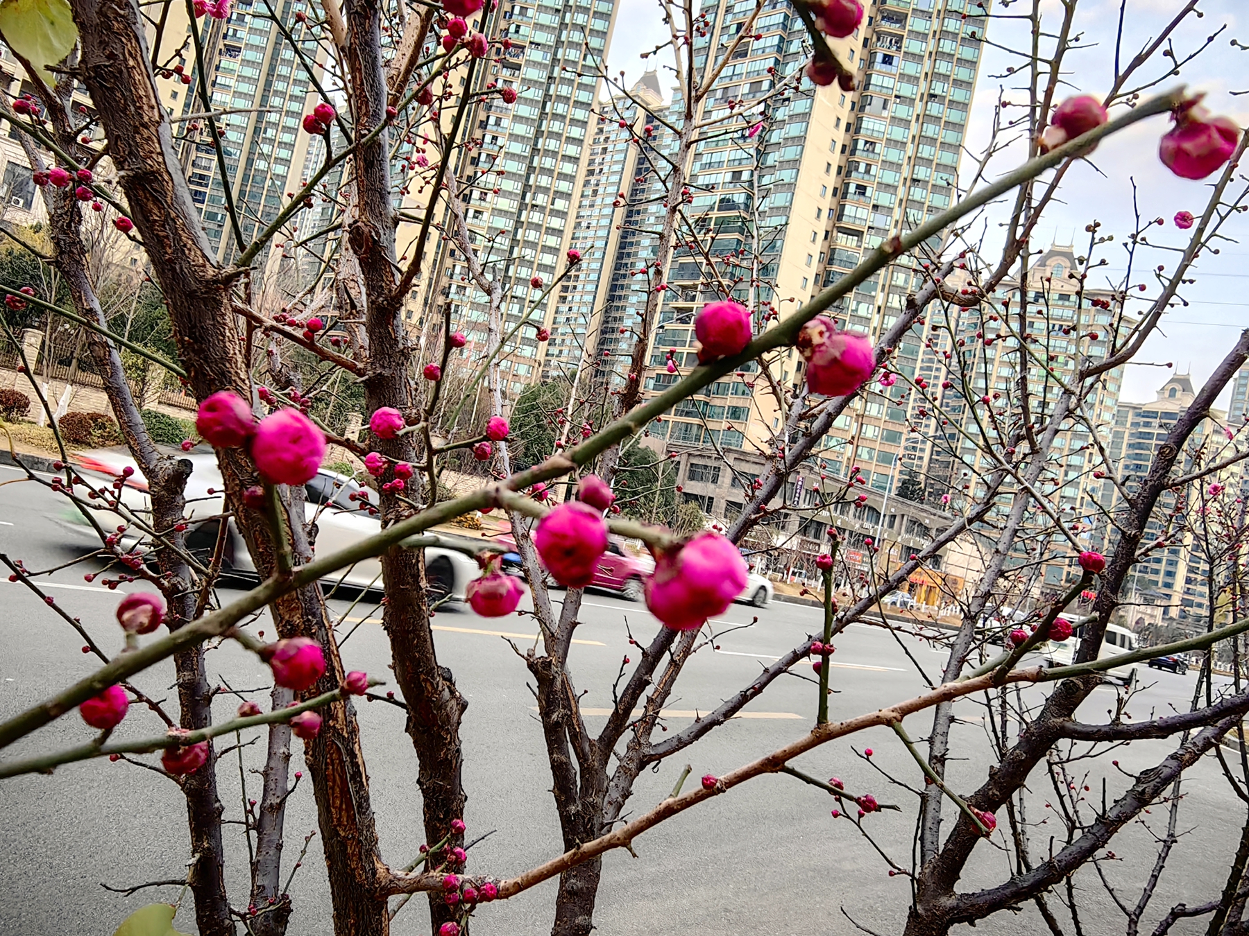 发展大道沿线的梅树点缀在人行道旁,错落有致形成带状景观。枝头的梅花或含苞待放,裹着细密的鳞片;或怒放吐香,在冬日晴空下格外醒目。微风拂过,花枝轻摇,浓郁却不艳俗的香气四处飘散。