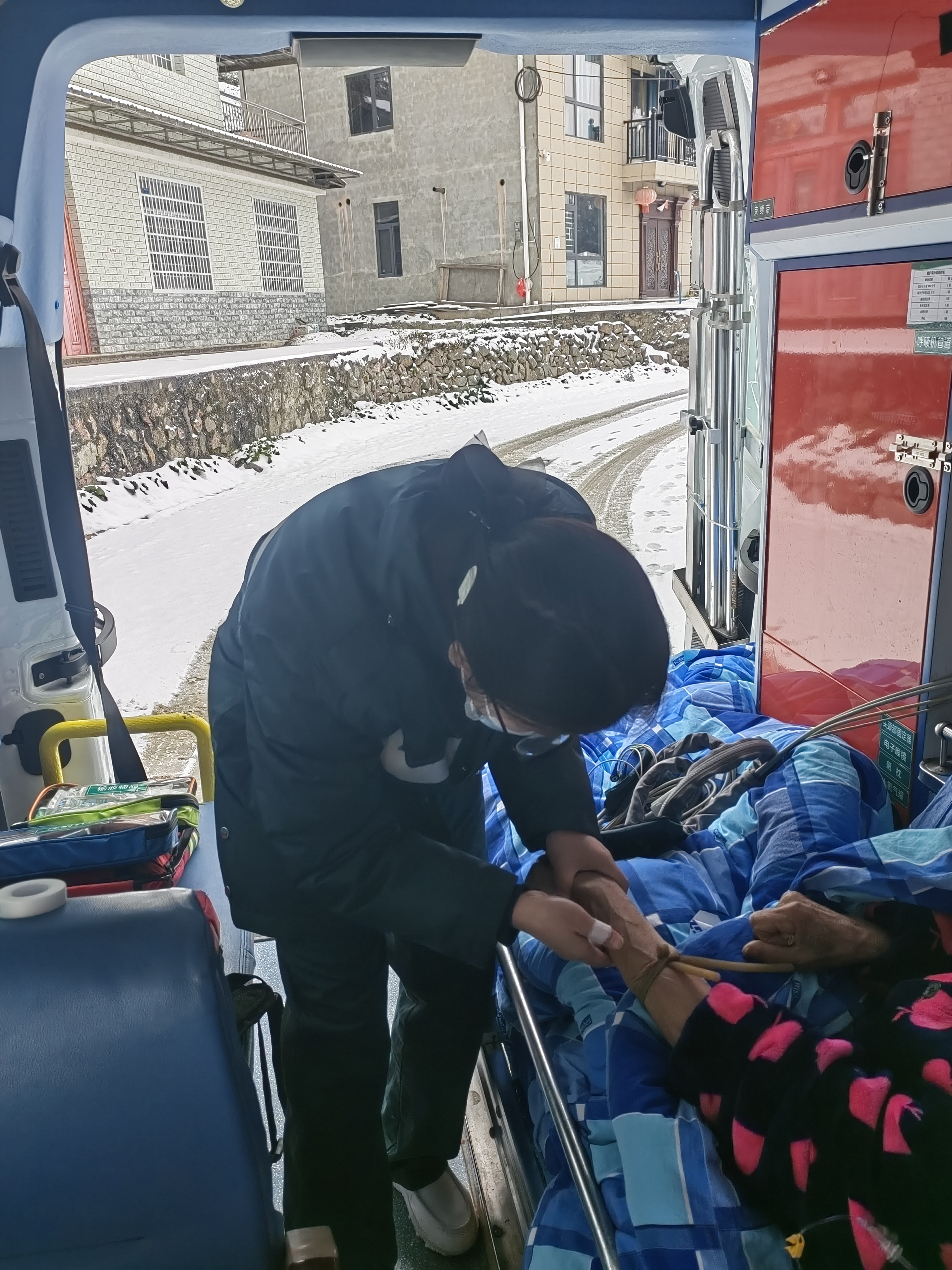 早上8时44分,邓村乡卫生院接到夷陵区急救中心调度指令称,邓村乡江坪村有一位腹痛伴便血患者需紧急转运救治,卫生院急救团队即刻响应,携带急救设备、药品立即赶往患者家中。因路面积雪,车辆行驶缓慢,加上路途遥远,途中多次调整防滑链,历经一个多小时艰难跋涉,救护车冲破风雪的阻挡于上午10时10分抵达患者家中,急救人员立即予以详细查体,查看患者排泄物,迅速建立静脉通道,持续心电监测,待患者症状稍有缓解后,果断决定转运至卫生院进行进一步治疗。于11时45分抵达卫生院后,启动绿色救治通道,展开进一步治疗。目前患者生命体征平稳,成功脱离危险。