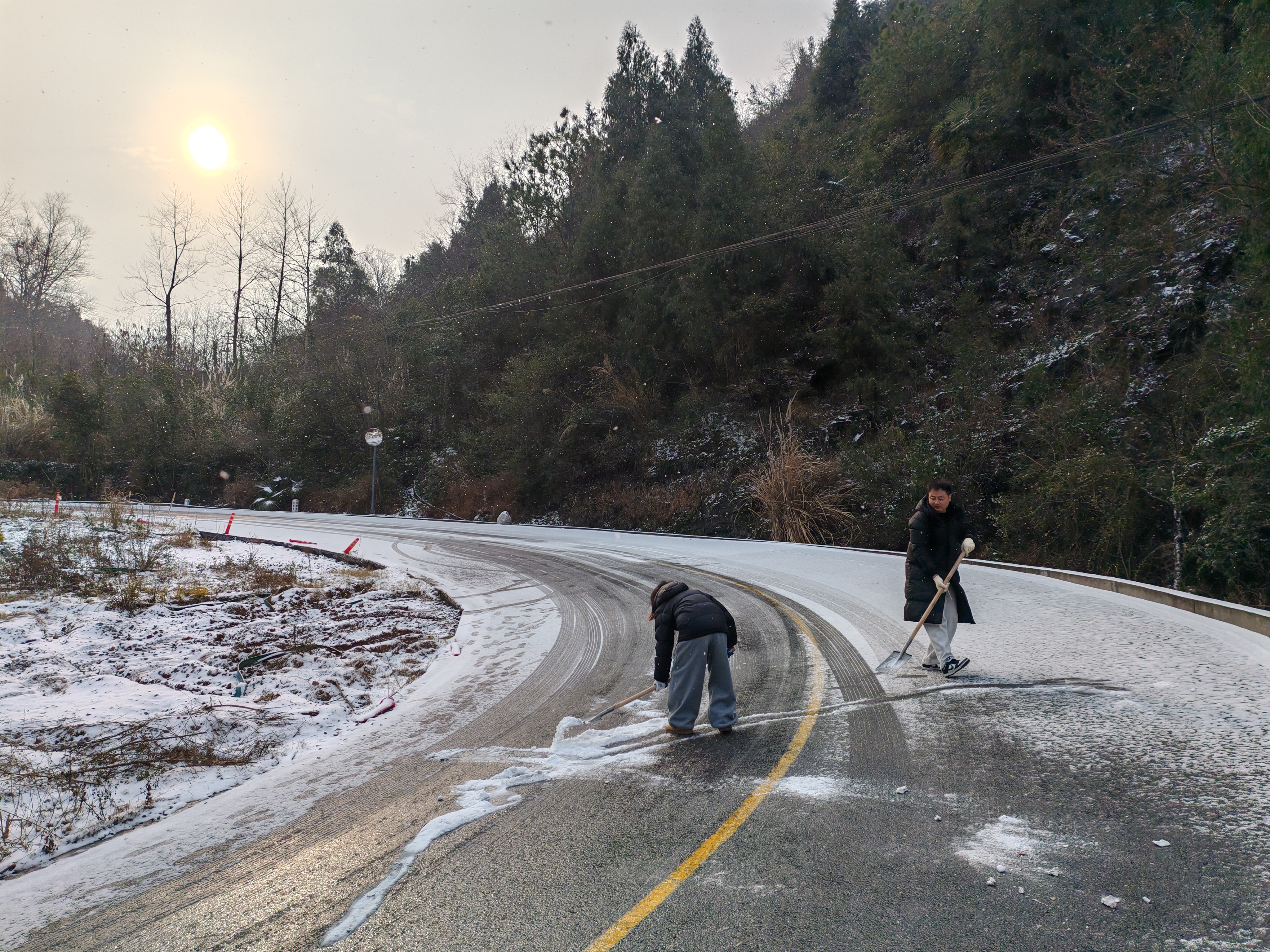 20日上午,村内坡道路段出现结冰迹象,村委会工作人员迅速携带铁锹、扫帚等工具赶赴现场。到达后,工作人员第一时间指挥过往车辆靠边停放,随后对结冰路面集中泼洒融雪剂,加速冰雪融化,并将路面堆积的积雪铲至边沟,疏通排水通道。道路积雪很快得到融化,车辆恢复通行。