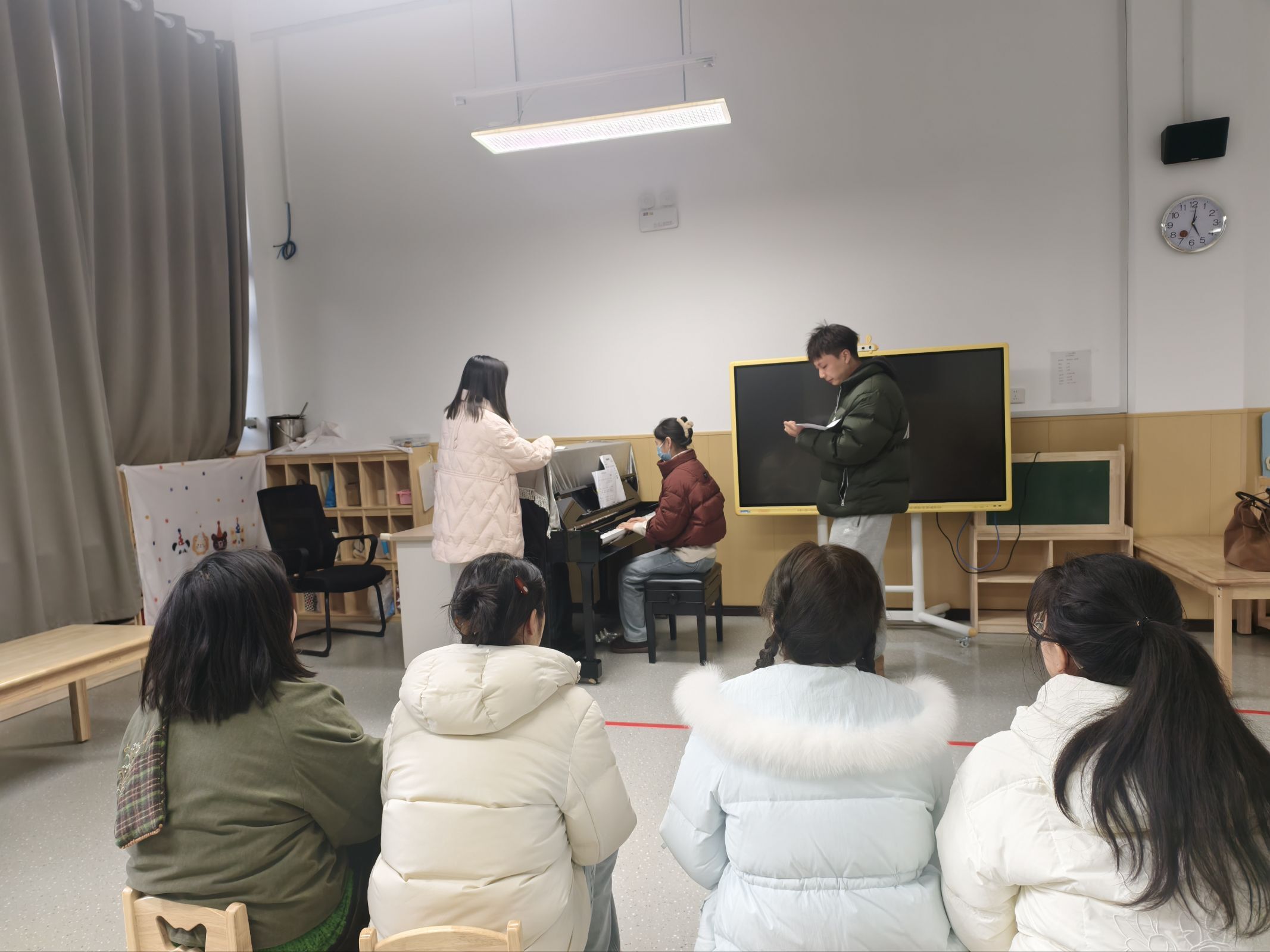 本次活动自12月底持续至1月中旬,内容全面覆盖幼儿园各岗位核心技能。教师考核聚焦教学基本功,包括弹琴弹唱、讲故事、舞蹈、说课及绘画等项目,综合展示教师专业能力。保育员则紧密结合日常工作实际,重点设置了规范消毒流程、呕吐物应急处置、幼儿生活护理等实操项目,凸显保育工作的规范性与细致度。