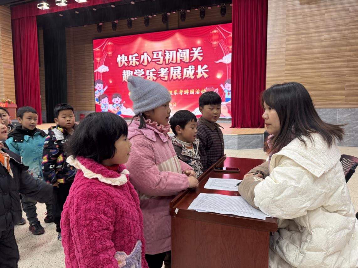 活动以趣味互动形式展开。语文测评区,一年级学生认读拼音卡片、抽生字盲盒、表演儿歌,二年级学生组词应答、朗读课文、看图表达,字正腔圆尽显积累;数学区里,孩子们速答加减运算、对答乘法口诀、辨认图形钟面,思维敏捷反应迅速;音乐区里,课本儿歌传唱悦耳,童真嗓音诠释热爱;体育场上,队列动作规范标准,跳绳翻飞间尽显活力。老师们耐心引导、公正评判,现场秩序井然。