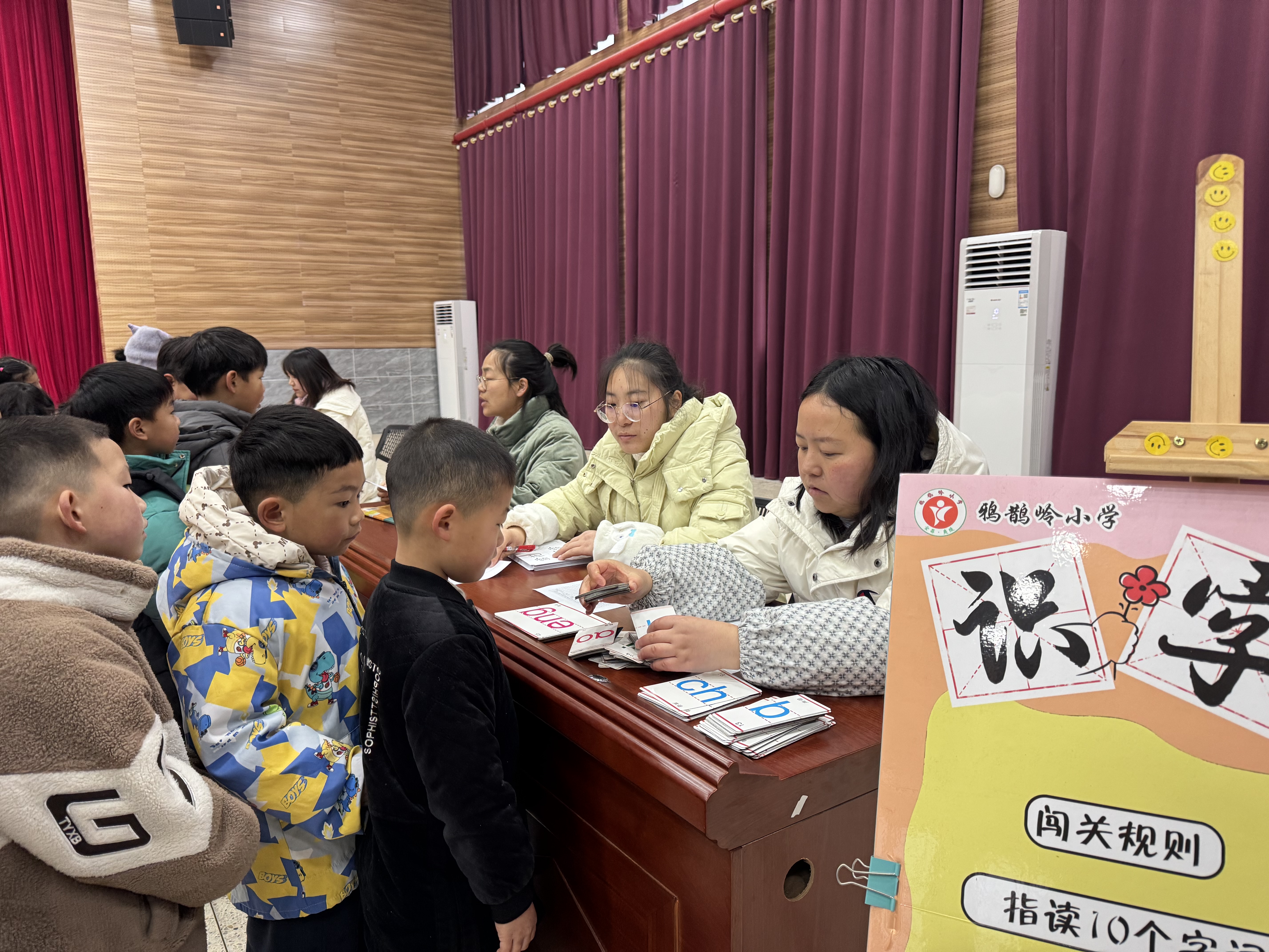 活动以趣味互动形式展开。语文测评区,一年级学生认读拼音卡片、抽生字盲盒、表演儿歌,二年级学生组词应答、朗读课文、看图表达,字正腔圆尽显积累;数学区里,孩子们速答加减运算、对答乘法口诀、辨认图形钟面,思维敏捷反应迅速;音乐区里,课本儿歌传唱悦耳,童真嗓音诠释热爱;体育场上,队列动作规范标准,跳绳翻飞间尽显活力。老师们耐心引导、公正评判,现场秩序井然又不失温情。