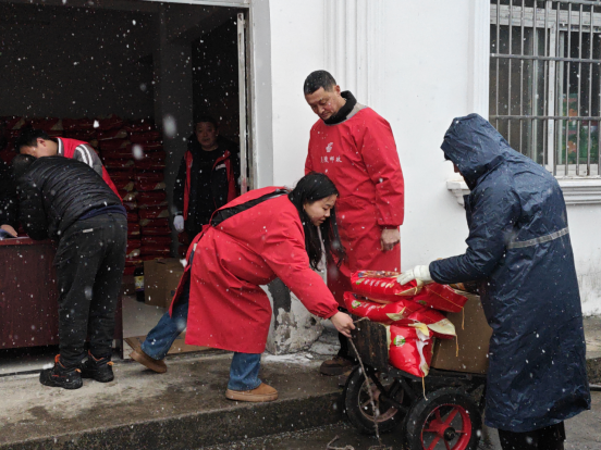 “大爷,您家3口人,这是3袋大米、3桶油,还有1箱柑橘,您拿好,注意脚下安全!”发放现场工作人员耐心嘱托,暖意融融。