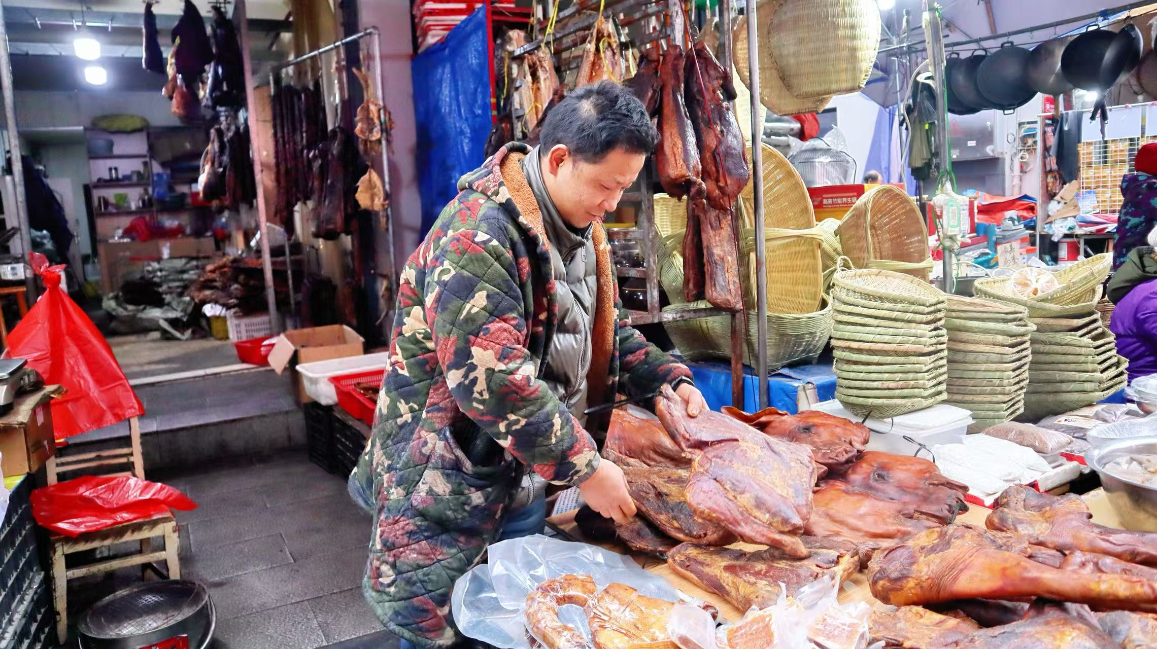 巷内的腊肉铺里,挂满屋檐的腊猪蹄、腊排骨、腊鱼与香肠色泽红润,散发着柴火熏制的独特香气。“我们这都是地地道道的农家腊货,品种齐全,一天能卖个一千斤左右。”店主彭赢一边为顾客打包香肠,一边笑着介绍。