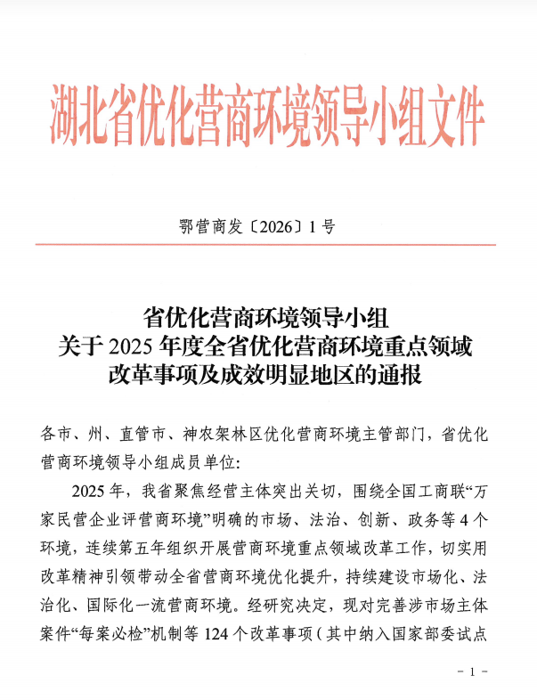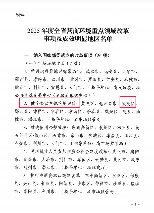 近日,湖北省优化营商环境领导小组公布了2025年度全省优化营商环境重点领域改革事项及成效明显地区名单,宜昌市夷陵区“健全经营主体信用评价”改革获通报表扬。