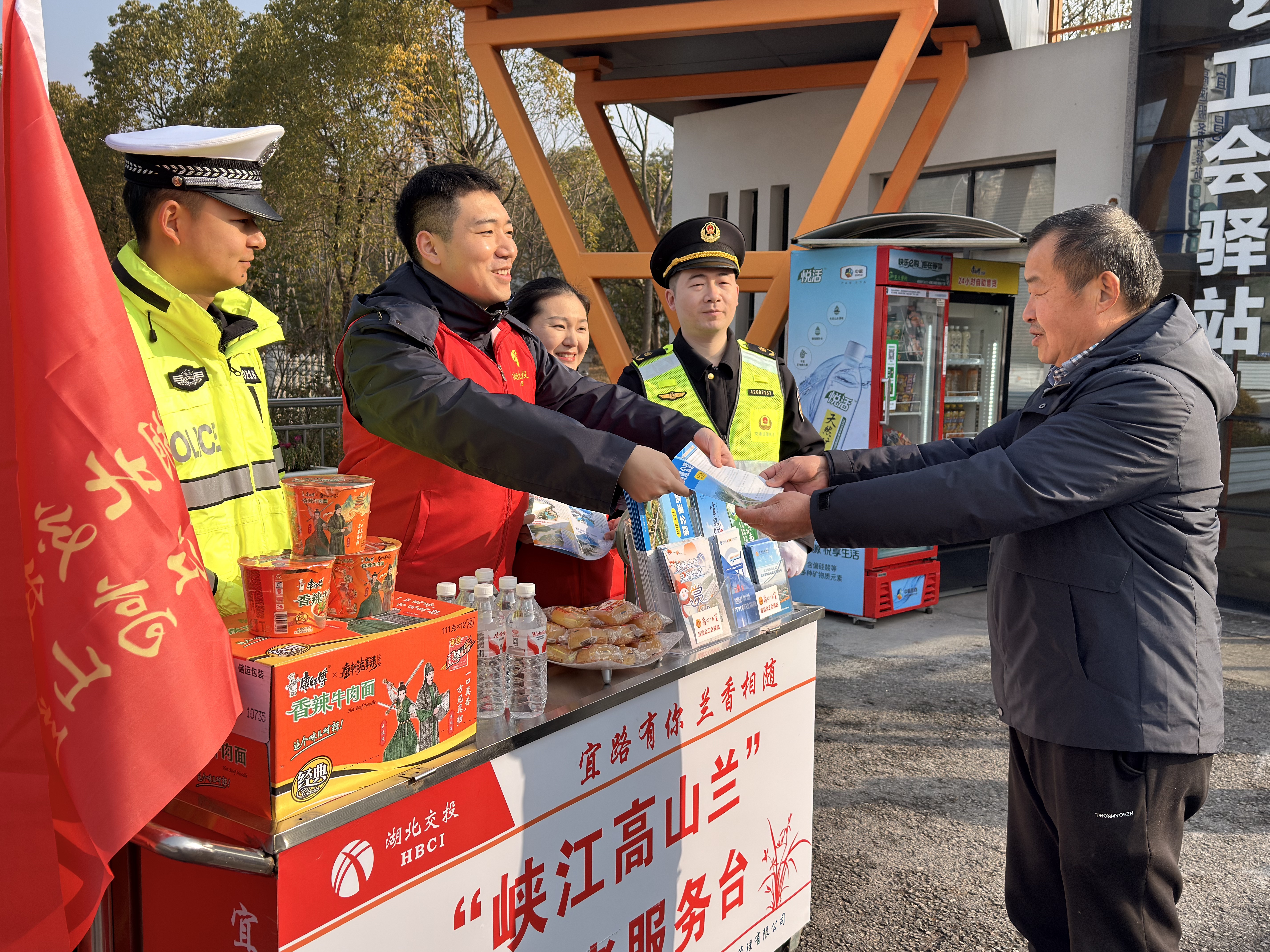 在“兰心惠宜”工会驿站前,“峡江高山兰”志愿者与高警、路政人员组成联合志愿服务队,为过往司乘提供一站式暖心服务。“峡江高山兰”志愿者服务台前,志愿者们不仅提供热水、应急药品、简易工具等物资帮助,还实时解答路况咨询,发放安全行车指南,积极宣传安全出行知识。驿站内“爱心小屋”全天开放,配备休息座椅、充电设备、应急药箱等便民设施,为旅途劳顿的旅客提供温馨休憩空间。
