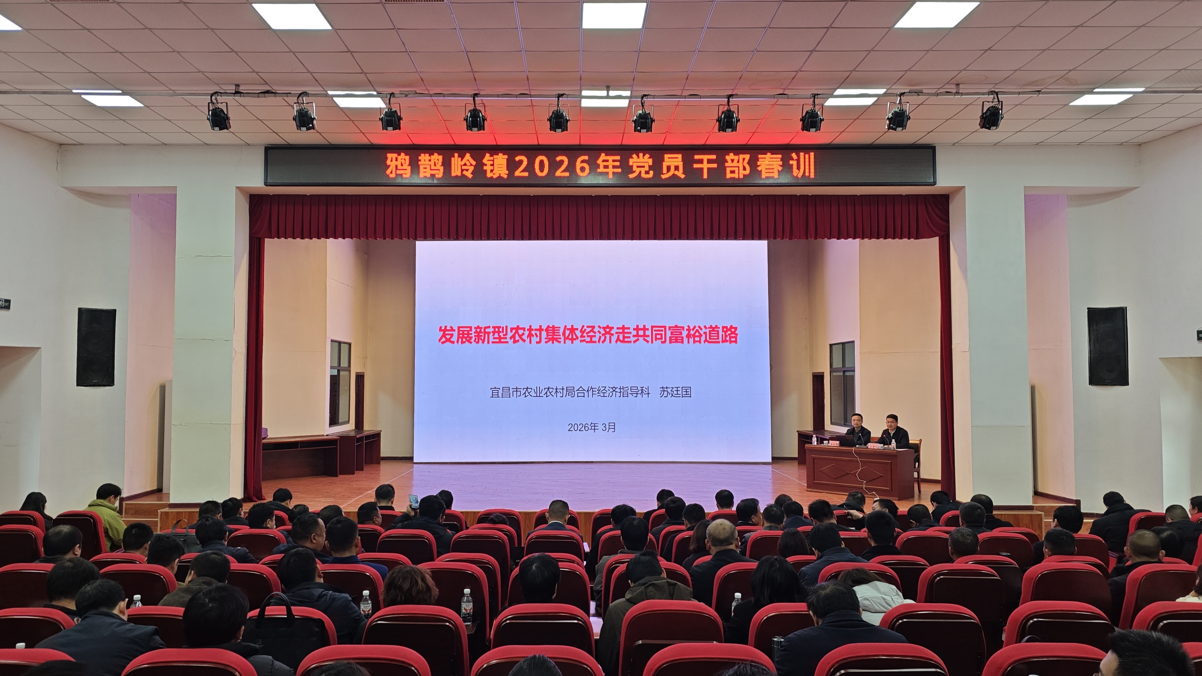 春潮涌动,战鼓催征。3月5日,鸦鹊岭镇2026年度党员干部春训在镇大礼堂正式启动。此次春训旨在深入学习贯彻党的二十届四中全会精神,全面落实《全国党员教育培训工作规划(2024—2028年)》任务,紧扣“十五五”开局起步要求,引导党员干部以学铸魂、以学增智、以学正风、以学促干。全镇全体班子成员、“六办两中心”干部、镇直单位负责人及业务骨干、各村(社区、场)“两委”班子及后备干部共200余人参加现场培训。
