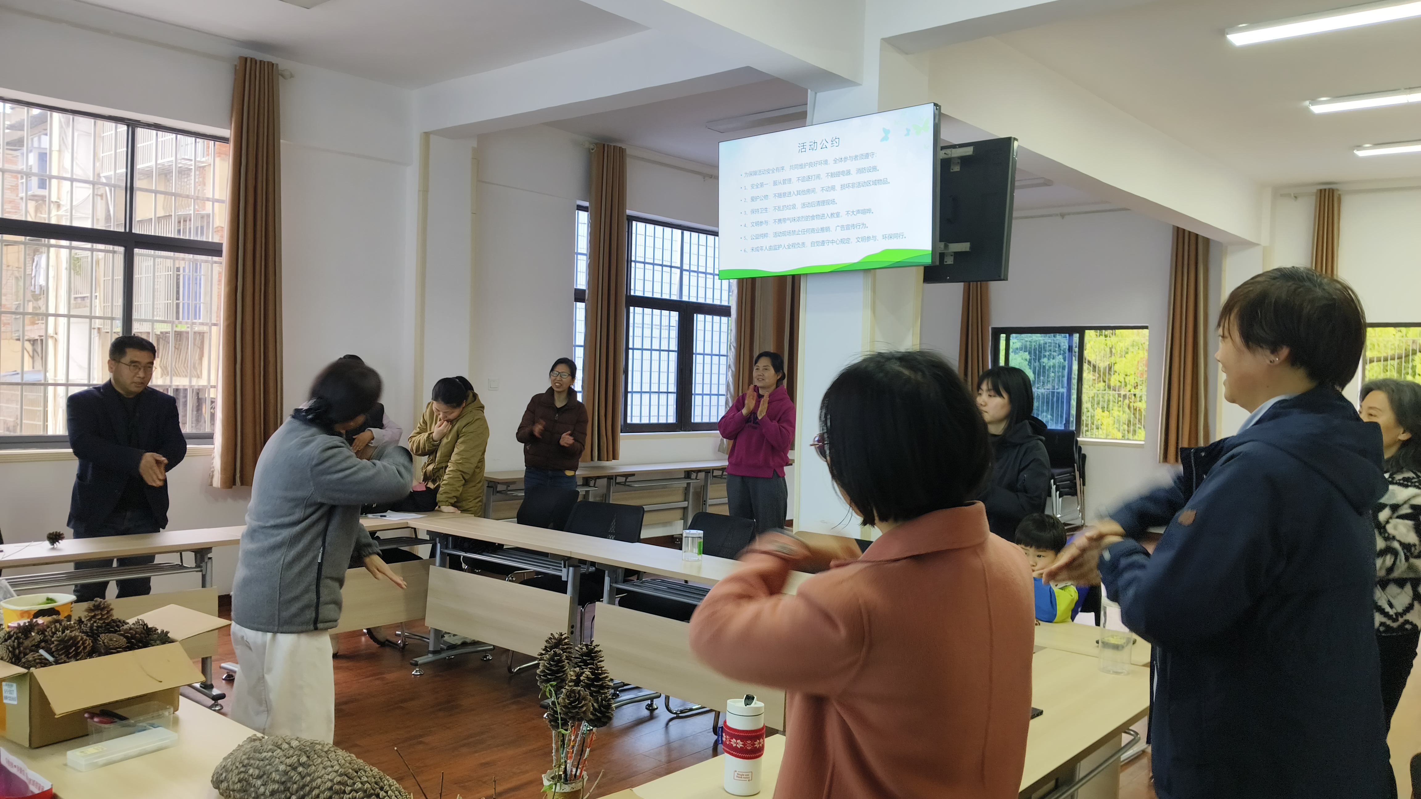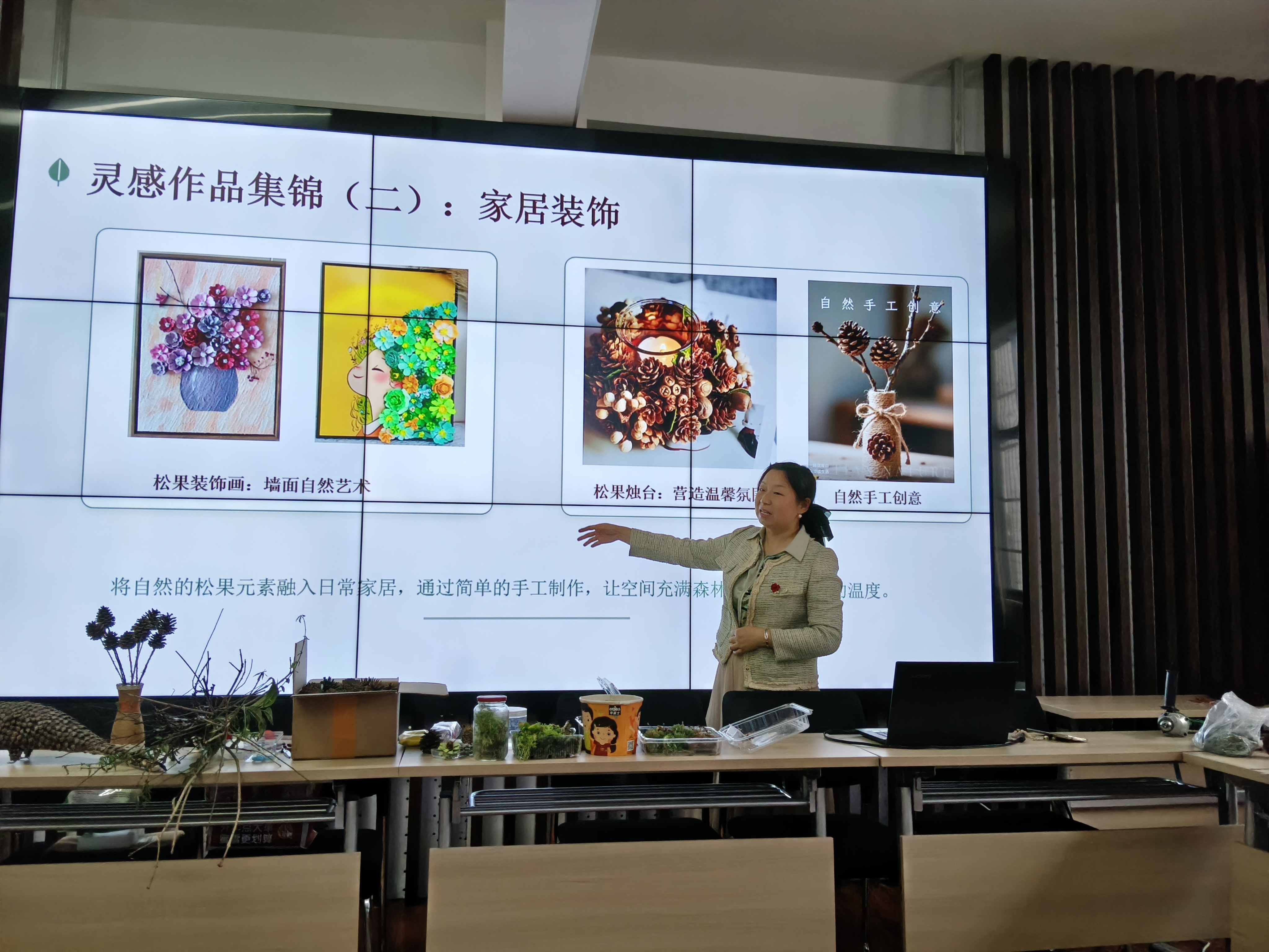 随后,孙老师细致讲解了松果手工制作与自然微景观打造的技巧与方法,从材料的挑选、修剪,到创意构思、粘贴组装、细节装饰,一步步耐心示范,引导大家发挥想象力,赋予自然废弃物全新的生命力。参与者们兴致盎然,全神贯注地投入到创作之中,大家相互交流、互帮互助,现场氛围热烈又融洽。