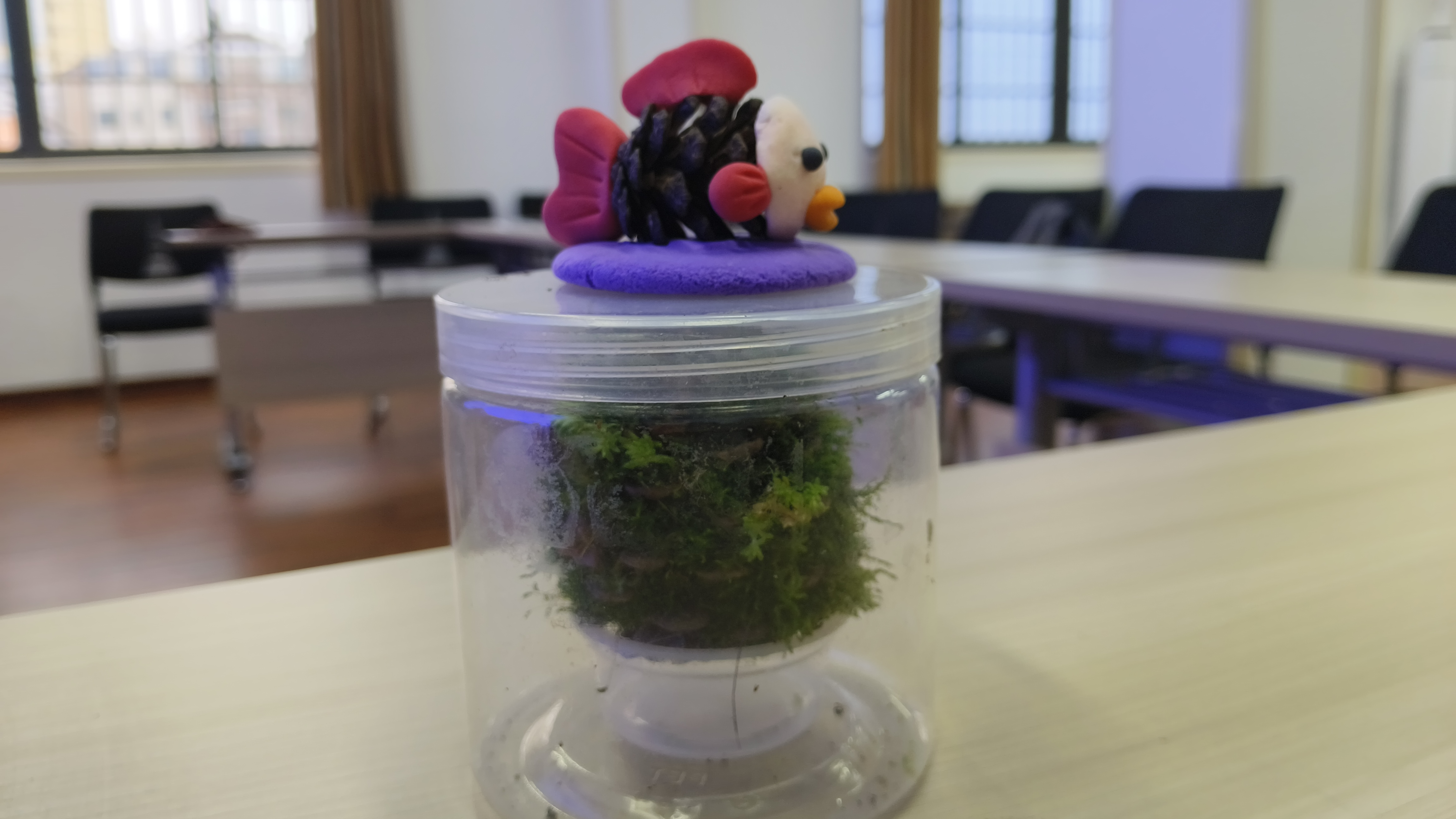大家携手合作,挑选心仪的松果,搭配色彩柔和的黏土、灵动的苔藓与可爱的多肉植物,精心打造属于自己的自然微景观;有的将松果精心雕琢、巧妙拼接,做成可爱的小动物摆件;有的以树枝为骨架,以松果为点缀,制作出精致的装饰画;还有的发挥奇思妙想,将多种自然材料组合,打造出充满诗意的微型森林景观。每一件作品都独具匠心,充满了自然气息与创意灵感,原本平凡的松果,在大家的巧手下华丽变身,成为了一件件精美又有意义的环保手作。