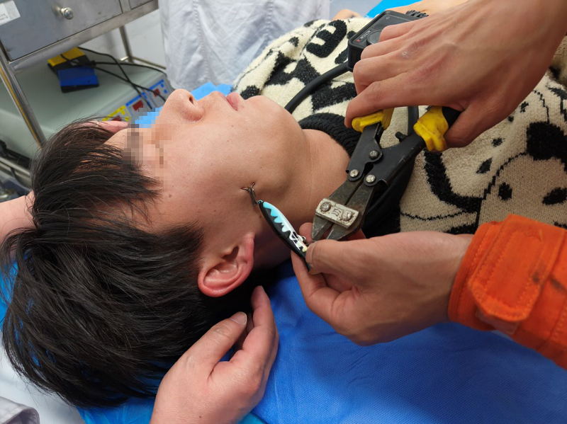 据悉,该男子在钓鱼时,不慎将鱼钩甩入自己面部,鱼钩倒刺嵌入较深,医护人员经过诊断,需剪断鱼钩外露部分再进行手术。然而,鱼钩材质坚硬,常规医疗工具难以快速切断,遂向消防部门请求支援。