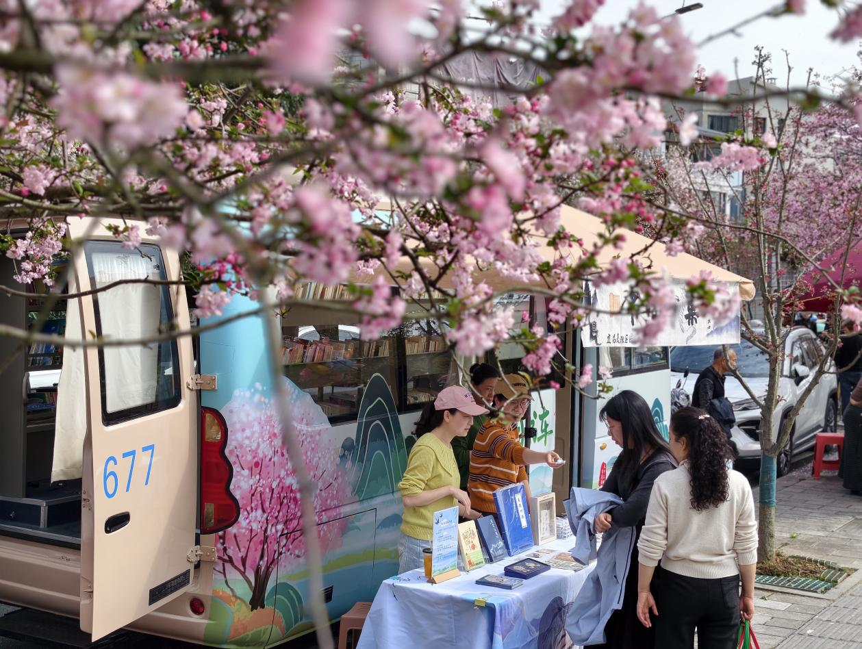 活动现场,区图书馆将“开往春天的图书车”停靠于海棠树下,成为花海中一道别致的文化风景线。现场提供图书翻阅、阅读指导等便民服务,更以春日、海棠为主题,打造了书香市集诗词问答、“花”字飞花令比拼等趣味互动环节。活动现场人气十足,家长与孩子们围坐花间沉浸式比拼诗词。盼盼幼儿园的小朋友们兴致勃勃登上图书车,在馆员引导下翻阅绘本、齐声诵读春日古诗,清脆童声回荡在花海中。不少前来游园的市民也纷纷驻足参与,或翻阅图书,或加入飞花令互动,在花香与书香交融中感受中华诗词的独特韵味,尽享春日文化盛宴。