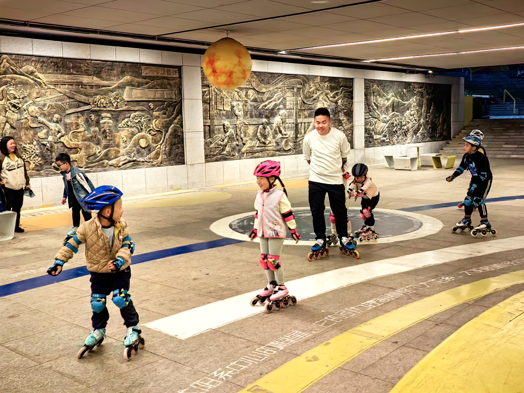 华灯初上,夜色温柔。夷陵区欧阳修公园与篮球公园之间的地下通道内,暖意融融。一处呈环形布局的开阔场地,成了孩子们晚间挥洒汗水的欢乐天地,灵动身影穿梭其间,勾勒出一幅鲜活的夜间童趣画卷。