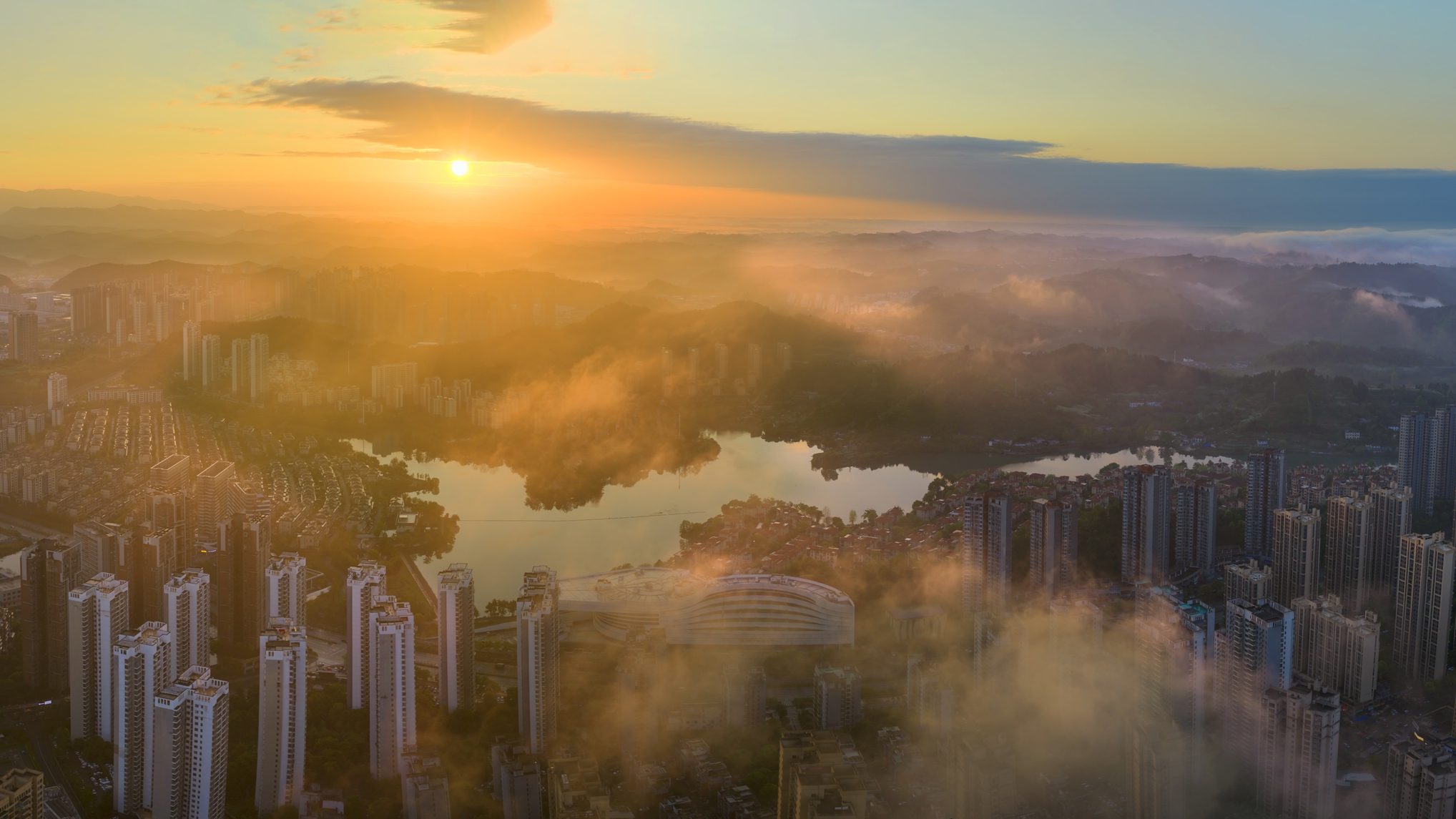 晨曦初露,东方天际霞光尽染,从绯红到金黄、从明橙到淡紫,层层铺展、美不胜收。霞光映照之下,水库水面波光潋滟,碧水与朝霞交相辉映,岸边错落有致的建筑、绿意盎然的生态绿地,共同构成难得一见的五彩景致,尽显夷陵清晨的灵动与秀美。