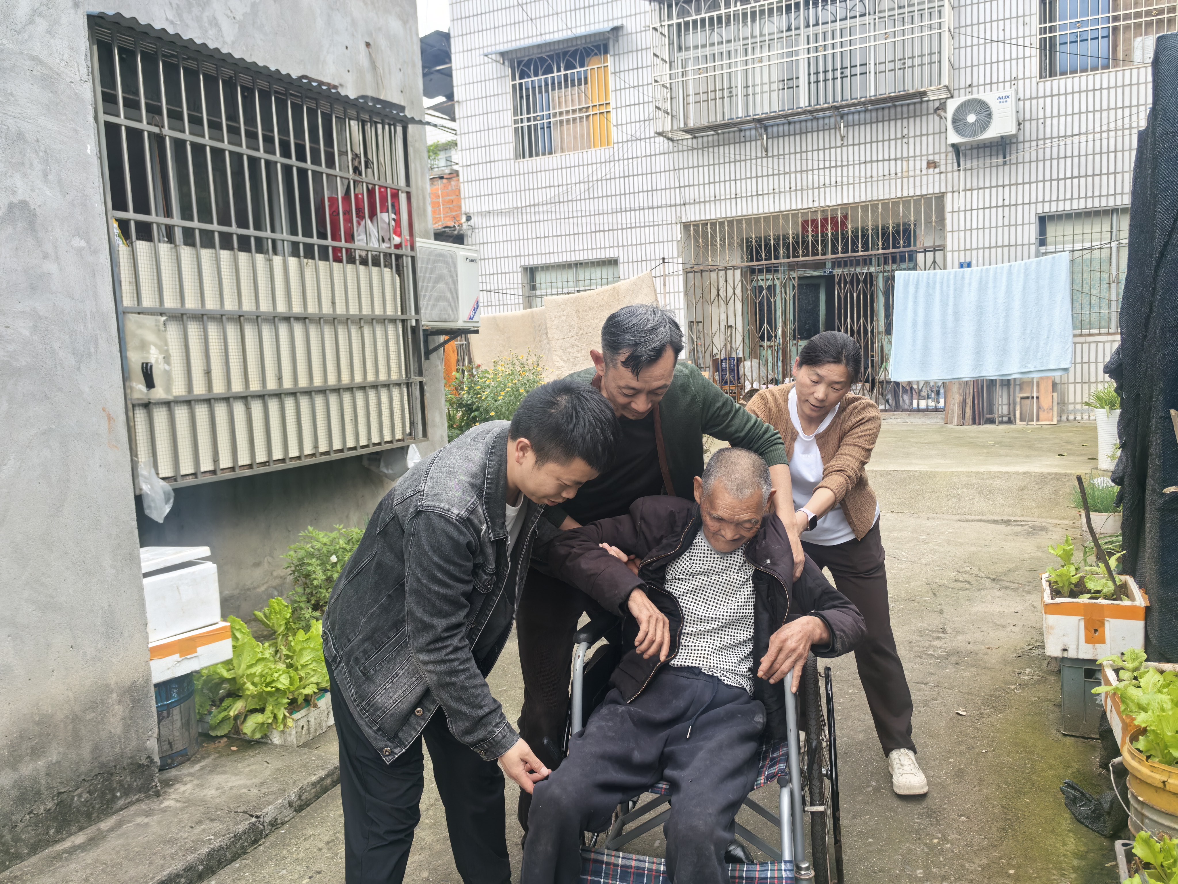 摔倒的是住在八巷的周爷爷。因身体突发不适,老人不慎倒地,虽然意识清醒,但一时无法自行起身。小周俯身安抚老人情绪,第一时间联系家属并同步告知现场状况。考虑到老人行动受限,工作人员提前准备好轮椅,在家属赶到后,众人合力将周爷爷平稳扶上轮椅,一路细心护送回家。临别前,小周又再三叮嘱家属注意后续照护细节与居家安全防范。