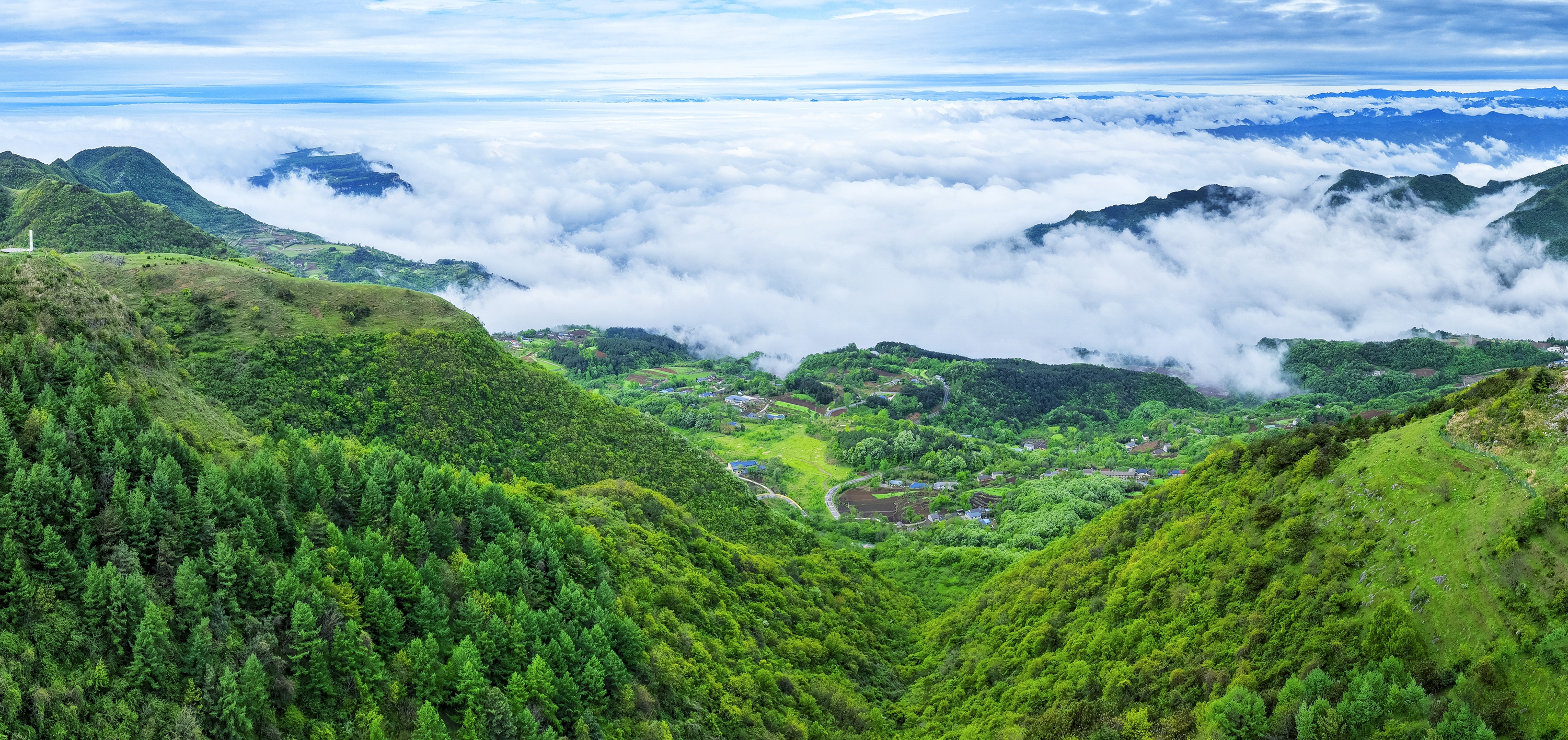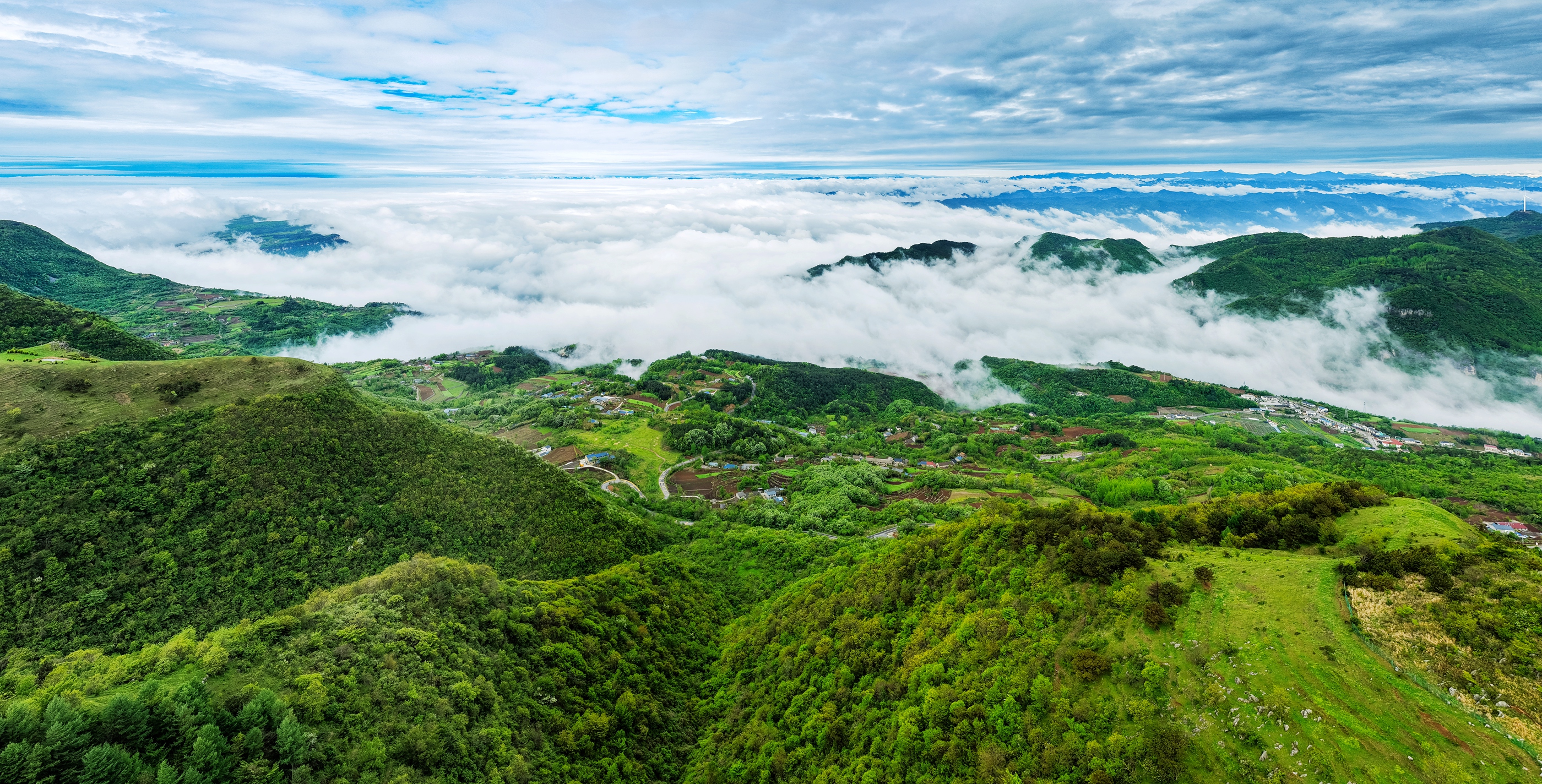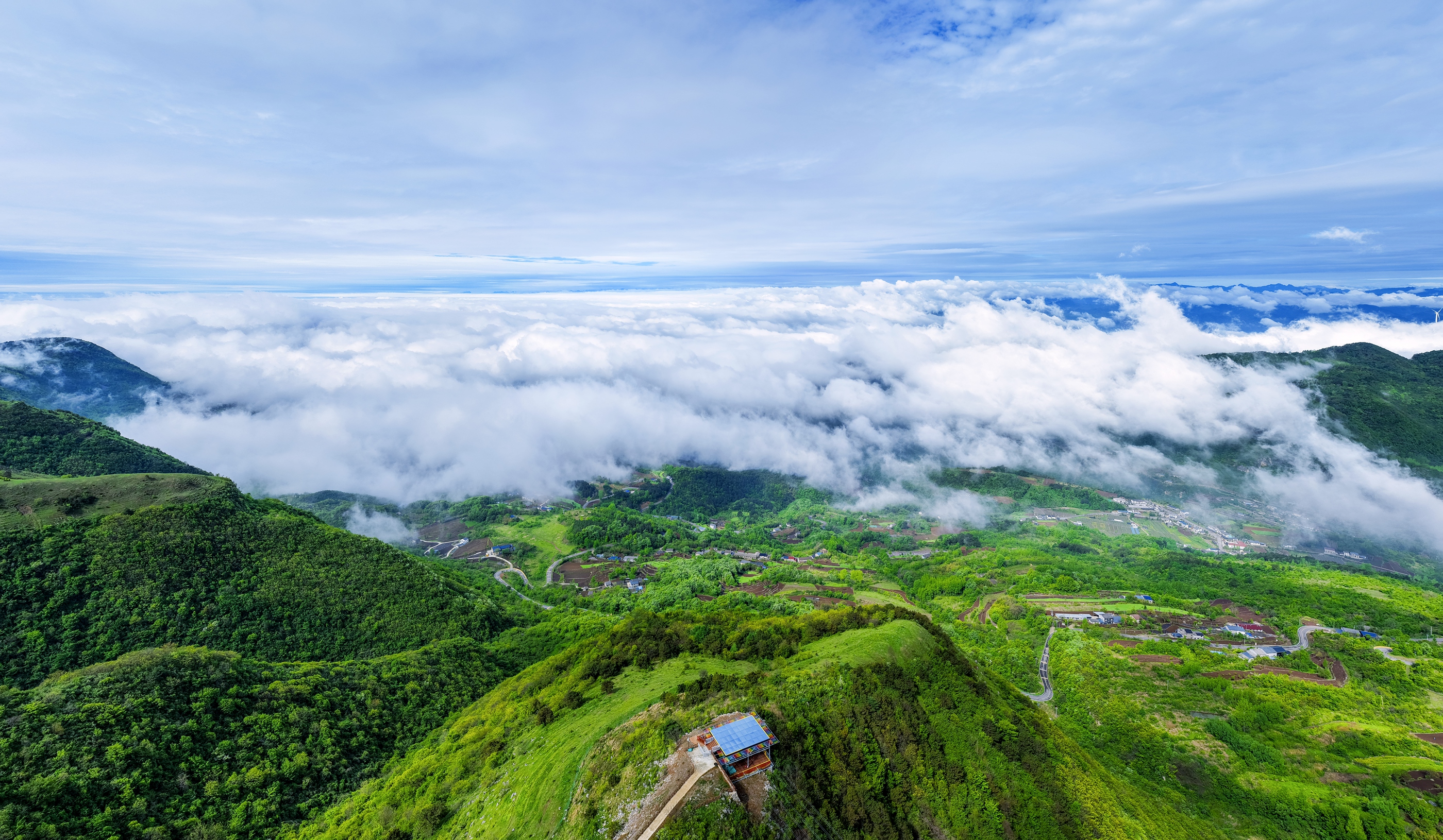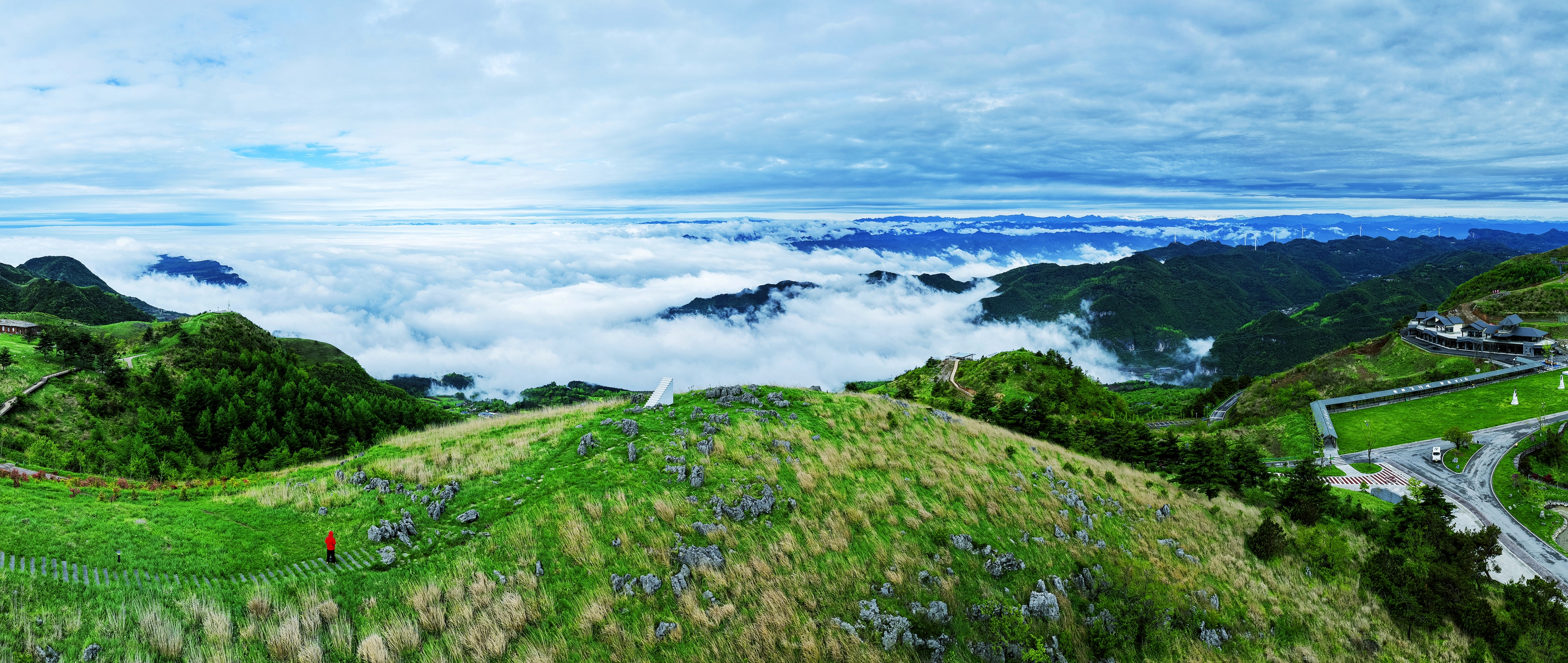 4月22日,降雨停歇后,宜昌百里荒景区呈现出云海景观,与山下浓雾缭绕形成鲜明对比,渐变新绿的高山草原与翻涌云海相映成趣,构成一幅绝美的生态画卷。