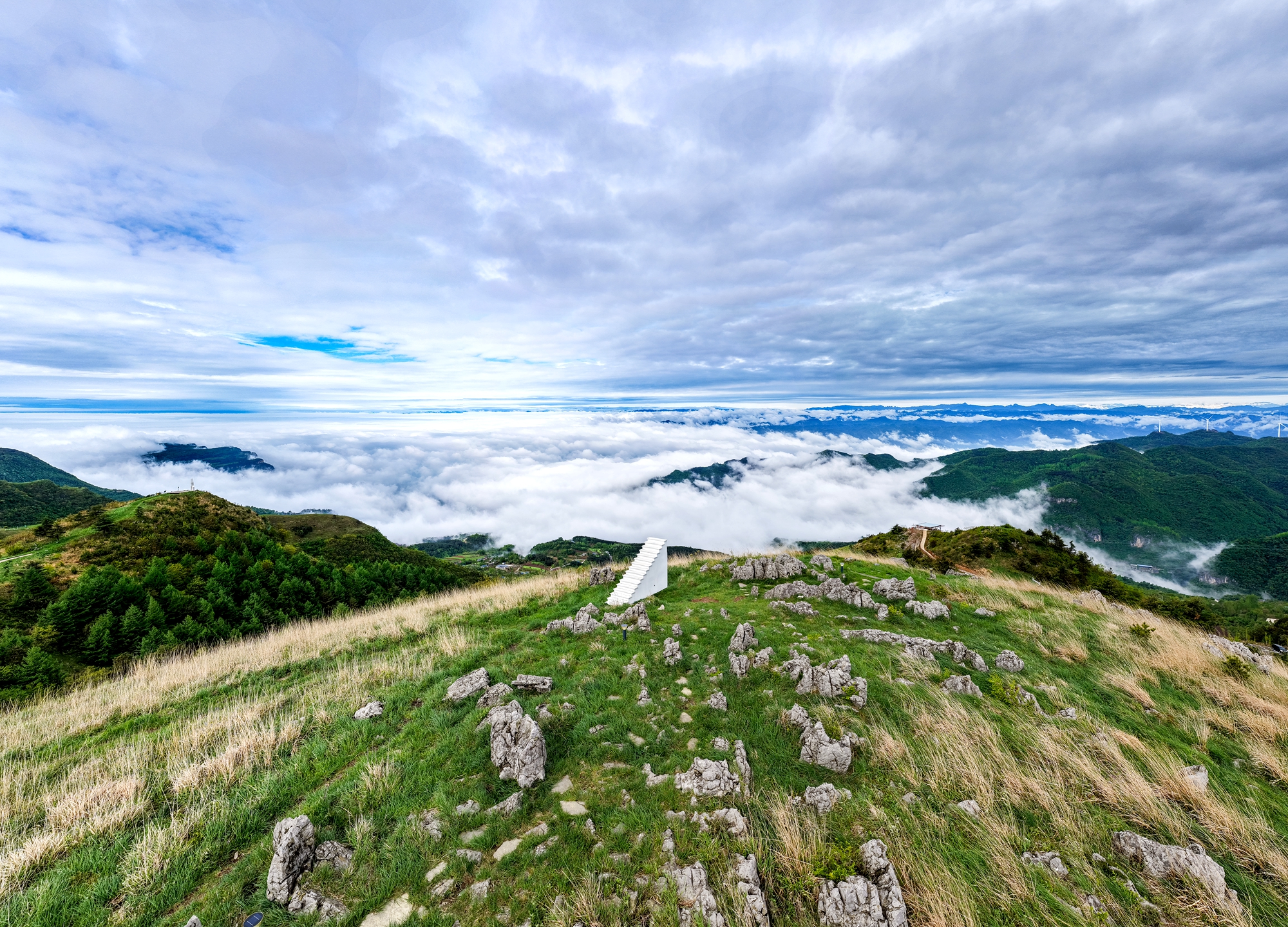 雨过天晴,沿着蜿蜒的“宋百爱情公路”盘旋而上,空气愈发清新。抵达山顶,推开车门,一幅巨大的“绿地毯”在眼前铺展开来,目之所及,皆是沁人心脾的翠绿。经过雨水冲刷,小草显得格外鲜嫩欲滴,在阳光照射下泛着光泽。三五成群的牛羊散落在草场上,悠然自得,远处白色的风车在云雾中缓缓转动,构成了一幅动静相宜的生态画卷。