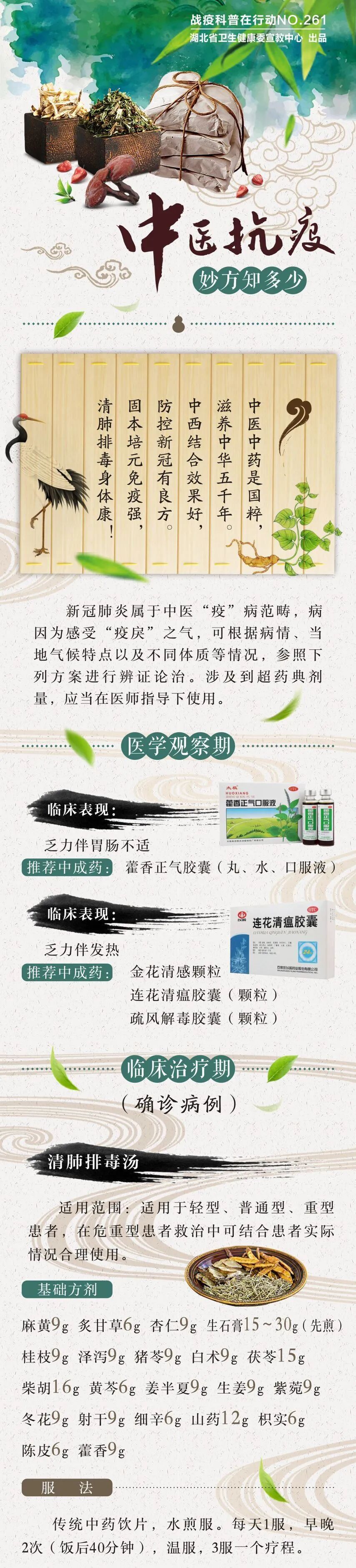 “中西结合效果好,防控新冠有良方。”2月27日,湖北省卫健委宣教中心发布权威中医科普,指出新冠肺炎属于中医“疫”病范畴,可根据病情、当地气候特点以及不同体质等情况,参照不同药方进行辨证论治,并发布了详细方剂、用量、用法。