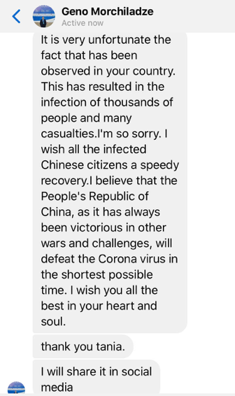 “请接受我诚挚慰问和良好祝愿。土库曼斯坦对中国人民面临的严峻疫情感同身受,赞赏中国政府为抗击疫情做出巨大努力,进行着史无前例的工作,中国人民在这一过程中表现出英雄气概,希望中方多提供素材,我愿更多宣传中国。”