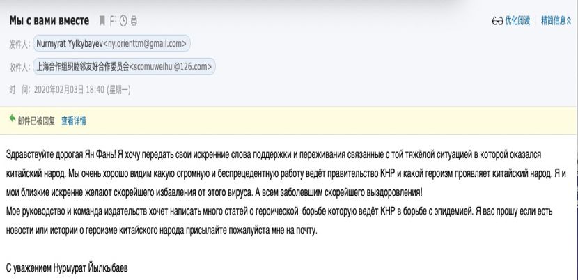 伊克巴耶夫将王毅国务委员兼外长在出席第56届慕尼黑安全会议期间接受路透社采访及发表的讲话、睦委会秘书处英文配音视频《武汉莫慌,我们等你》转发至土库曼斯坦国际新闻网站,录制视频《我们与中国同在,加油》(We are together with China, go),用汉语、土库曼语、俄语、英语四种语言表达对中国的支持,坚信中国和中国人民必将取得抗击疫情最终胜利并实现社会经济更大发展。