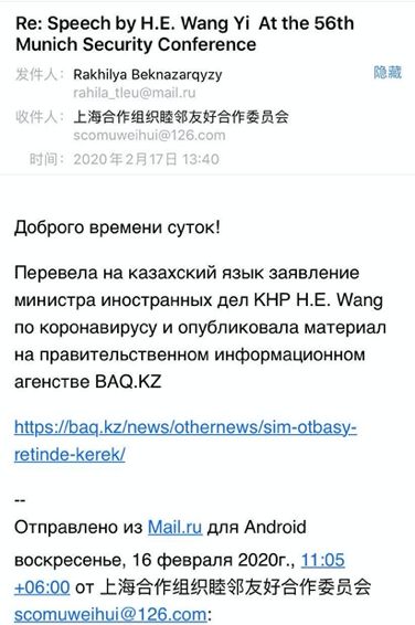“我已将王毅国务委员兼外长在出席第56届慕尼黑安全会议期间接受路透社采访及发表的讲话译成哈萨克语并发表在哈政府网上。我们与中国朋友并肩作战,共同守护健康。”